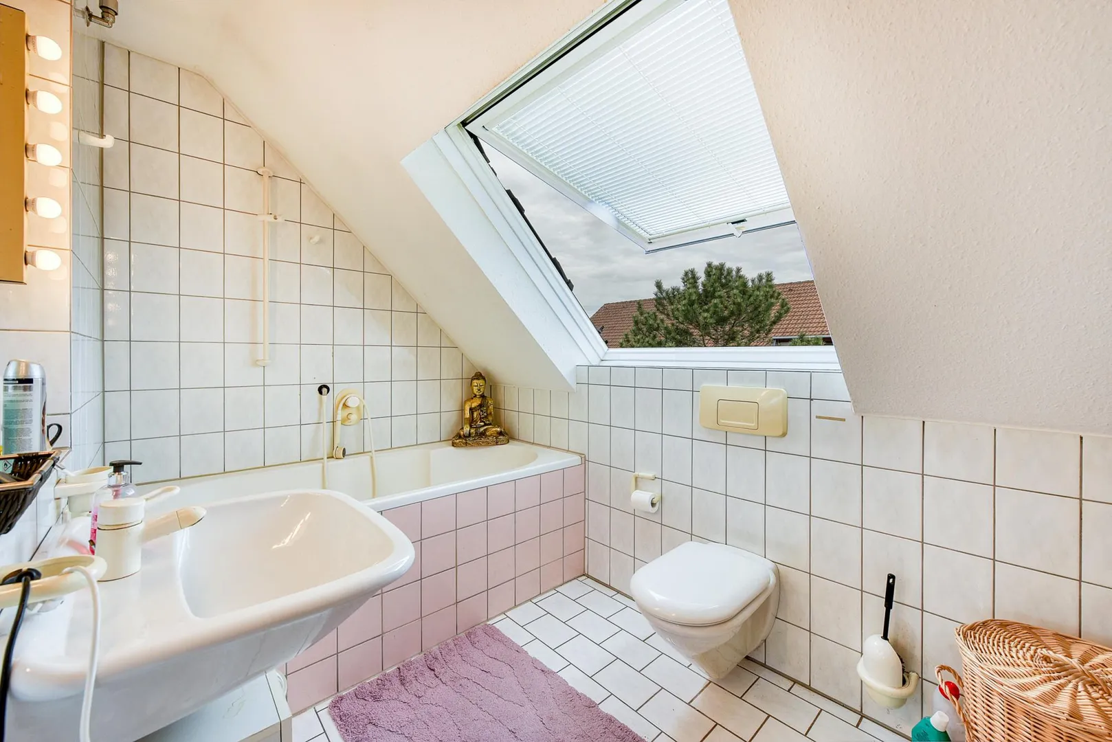 Das raumhoch geflieste Badezimmer mit Fenster ist ausgestattet mit einer Badewanne sowie einem WC.