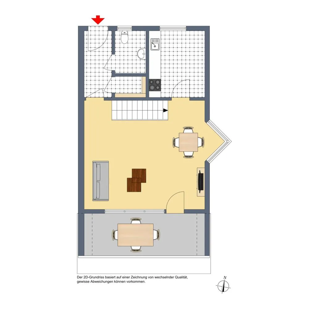 Auf der unteren Ebene (2.Obergeschoss) befindet sich der Wohnungseingang mit einem Windfang, ein separates WC mit Fenster, ein Abstellraum, der Wohn-/Essbereich, der Süd-Balkon sowie die Küche.
