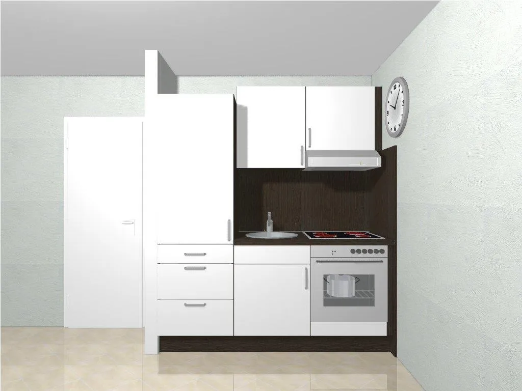 Die offene Küche ist mit einer neuen Küchenzeile ausgestattet. Die neue Küchenzeile beinhaltet einen Kühl-/Gefrierschrank, einen Herd mit Backofen und Dunstabzug sowie Ober- und Unterschränke.
