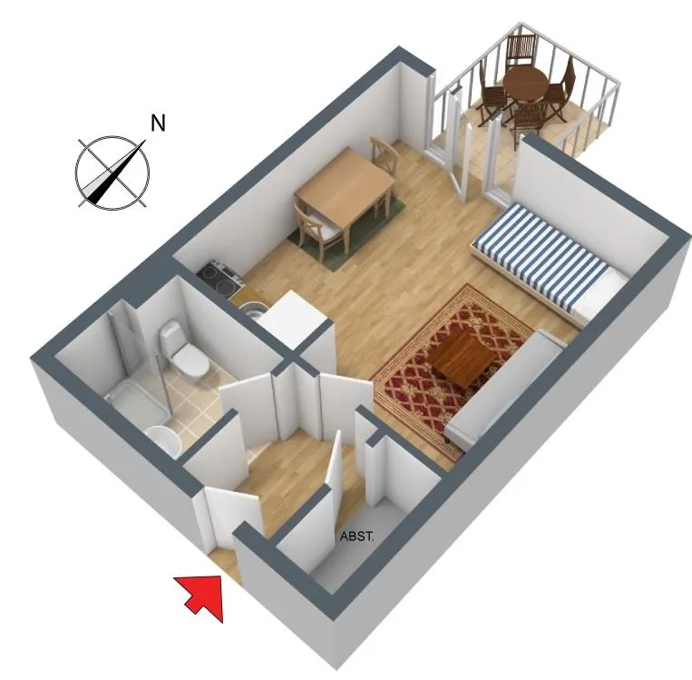 Der ca. 3,5 m² große und überdachte Balkon und das Zimmer sind nach Norden ausgerichtet.