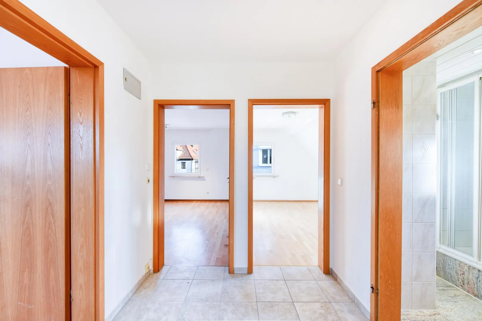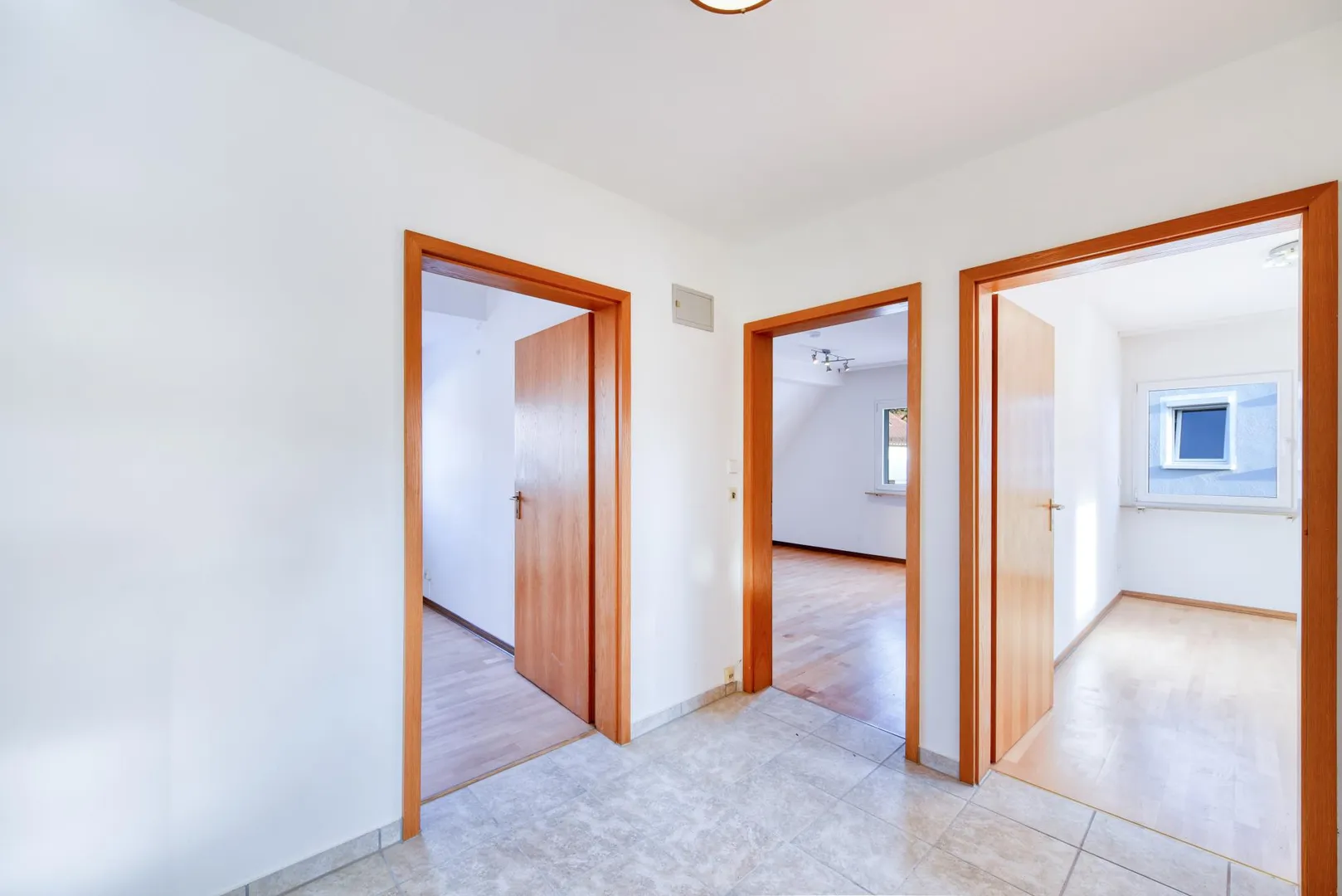 Die Zimmer sind mit Fertig-Parkett-Böden ausgestattet. Die Böden in der Diele, im Badezimmer sowie in der Küche sind gefliest.