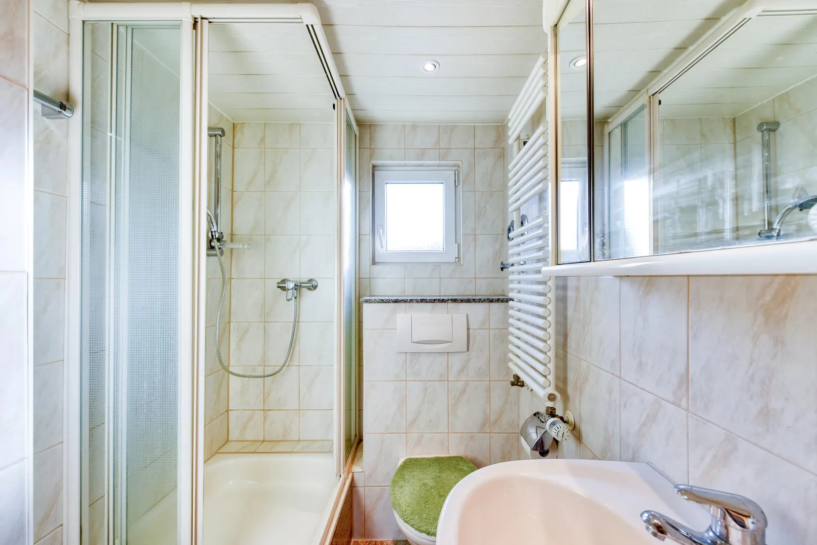 Das raumhoch geflieste Badezimmer mit Fenster ist ausgestattet mit einer Dusche, einem WC, einem Handtuch-Heizkörper, einem Spiegelschrank sowie einer Halogendecke.