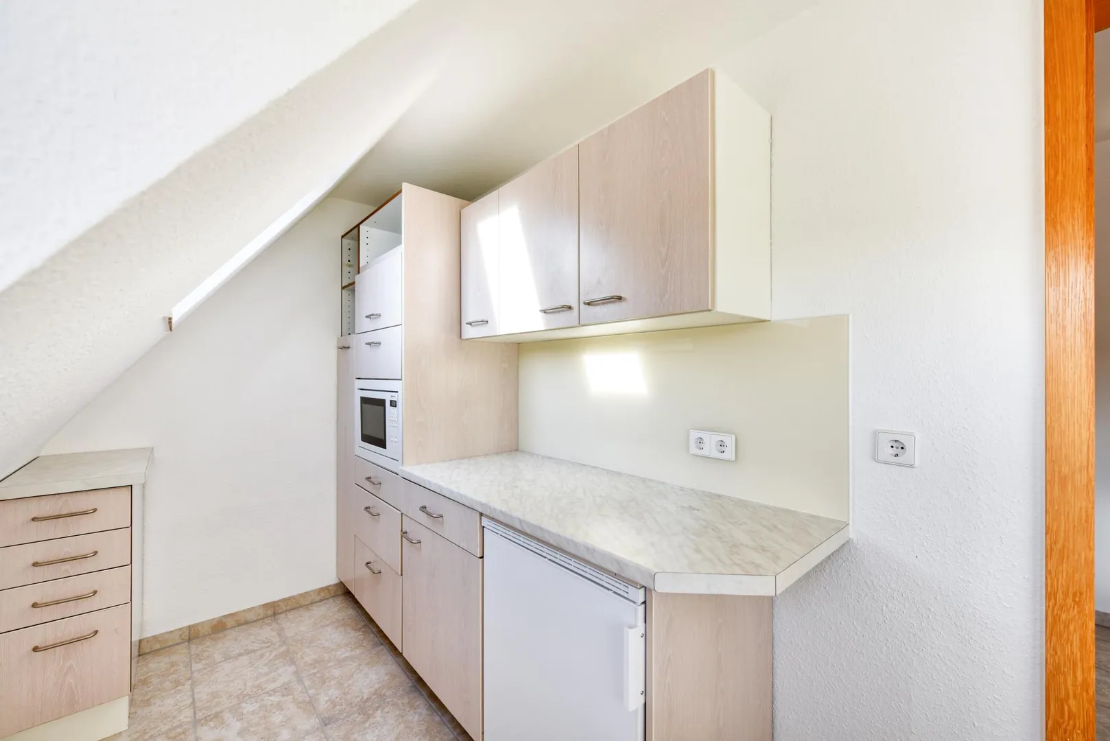 Die Wände sind überwiegend mit Raufasertapeten tapeziert und frisch, weiß gestrichen. Die maximale Raumhöhe beträgt ca. 2,44 Meter.