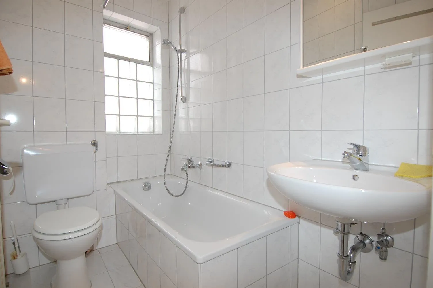 Das Badezimmer ist raumhoch gefliest und verfügt über ein Fenster. Es ist mit einer Badewanne, einem WC, einem Waschbecken und einem Handtuchheizkörper ausgestattet.