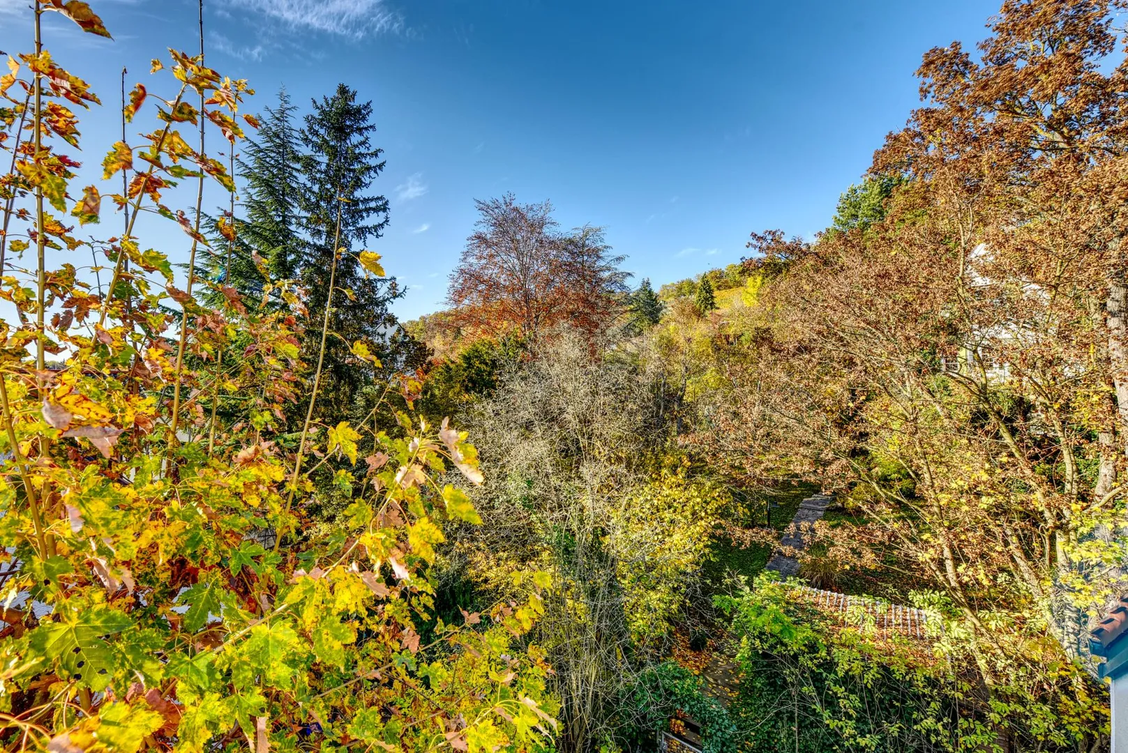 Das Wohnhaus befindet sich ca. 30 Meter von der Straße entfernt. Das Grundstück grenzt auf der Nordseite direkt an Gärten, diese wiederum an den Lemberg mit Weinbergen. Auf der Nordseite ist es grün, absolut ruhig und idyllisch.