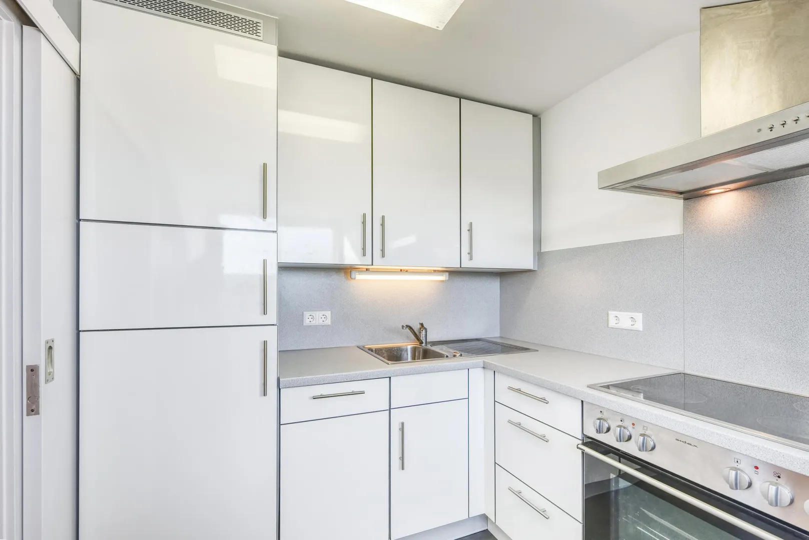 Die Küche ist mit einer Schiebetür, einem PVC-Boden, einer Einbauküche sowie einer Essecke ausgestattet. Die Einbauküche wurde ca. 2010 eigebaut und verfügt über einen Kühlschrank mit Gefrierfach, einen Herd mit Backofen und Dunstabzugshaube, eine Spülmaschine sowie Unter- und Oberschränke.