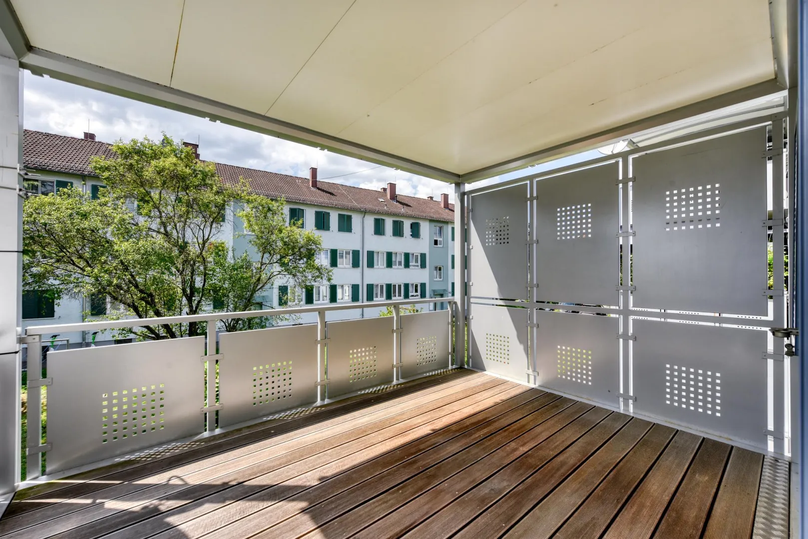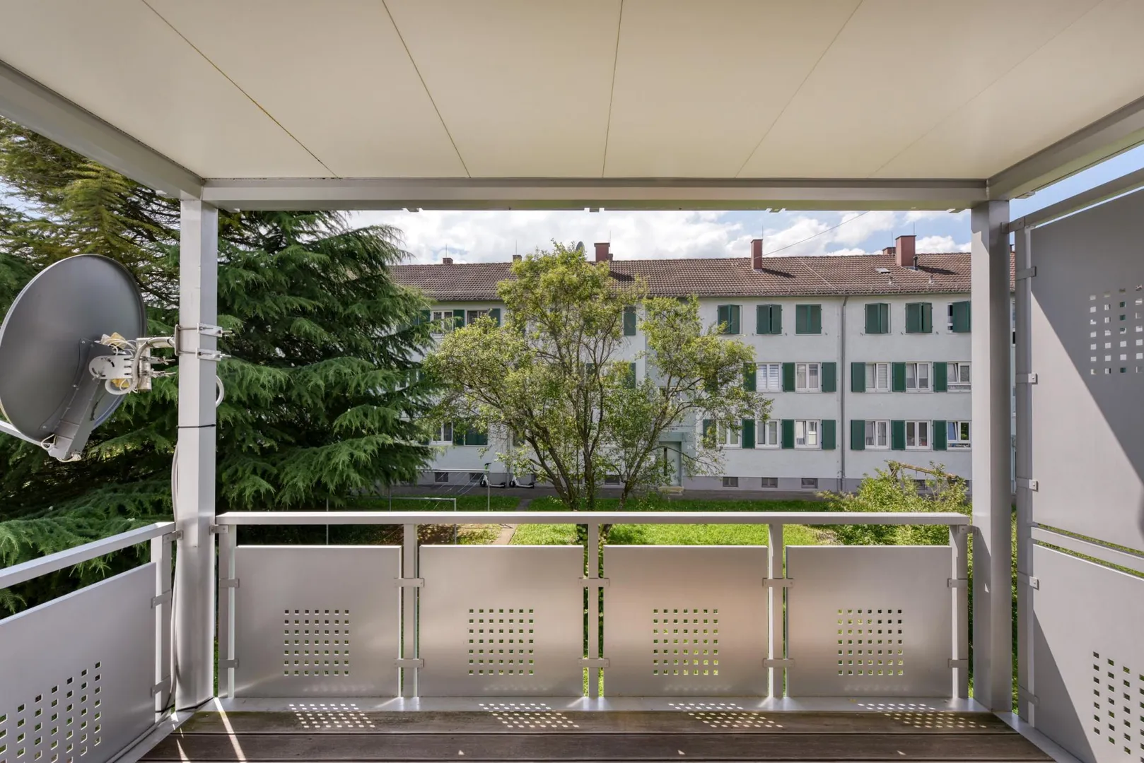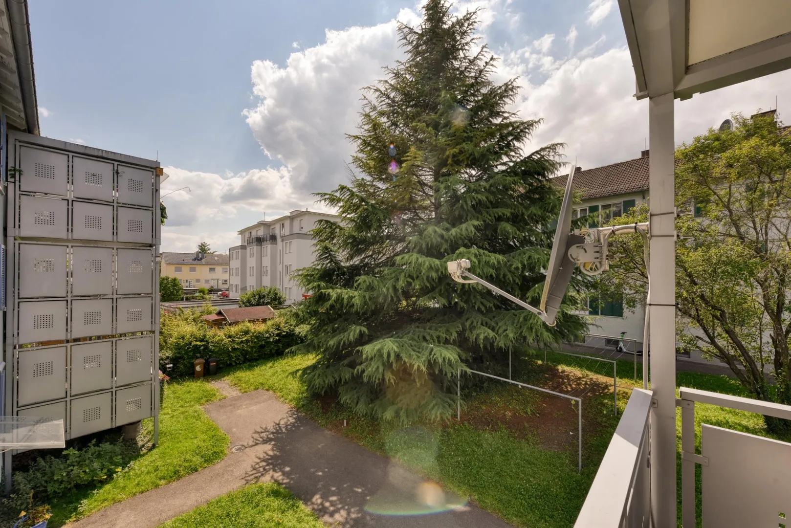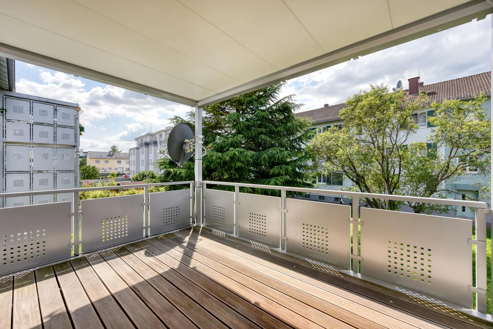 Das Wohnzimmer sowie der Balkon sind nach Westen ausgerichtet. Das Badezimmer, die Küche sowie die zwei weiteren Zimmer sind nach Osten ausgerichtet.