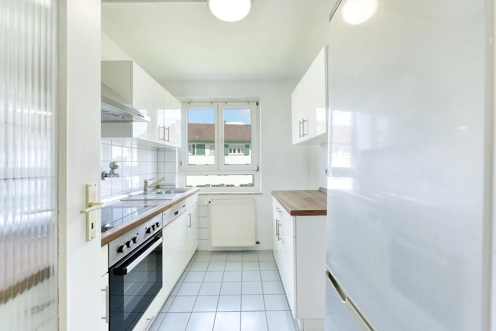 Die Küche ist ausgestattet mit einem Fliesenboden sowie einer Einbauküche.