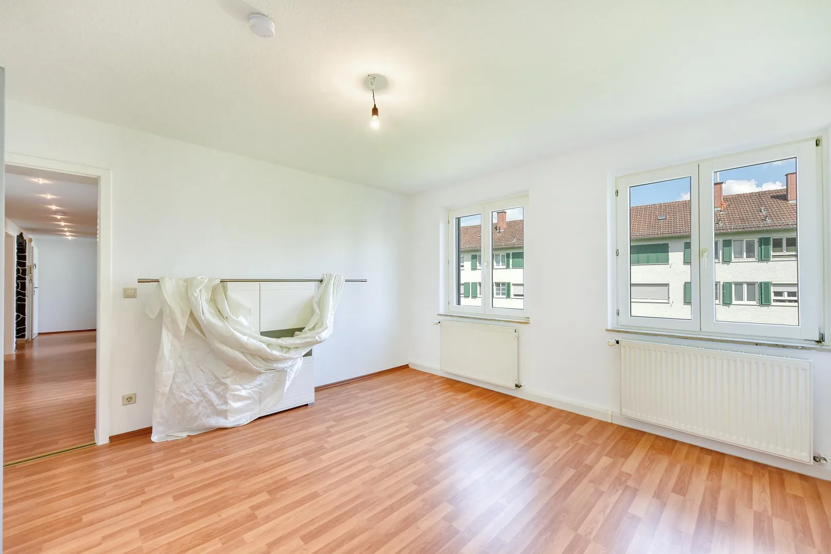 Im Flur, im Wohnzimmer sowie im Schlafzimmer ist Laminatboden verlegt. Im dritten Zimmer ist Linoleum-Boden verlegt.