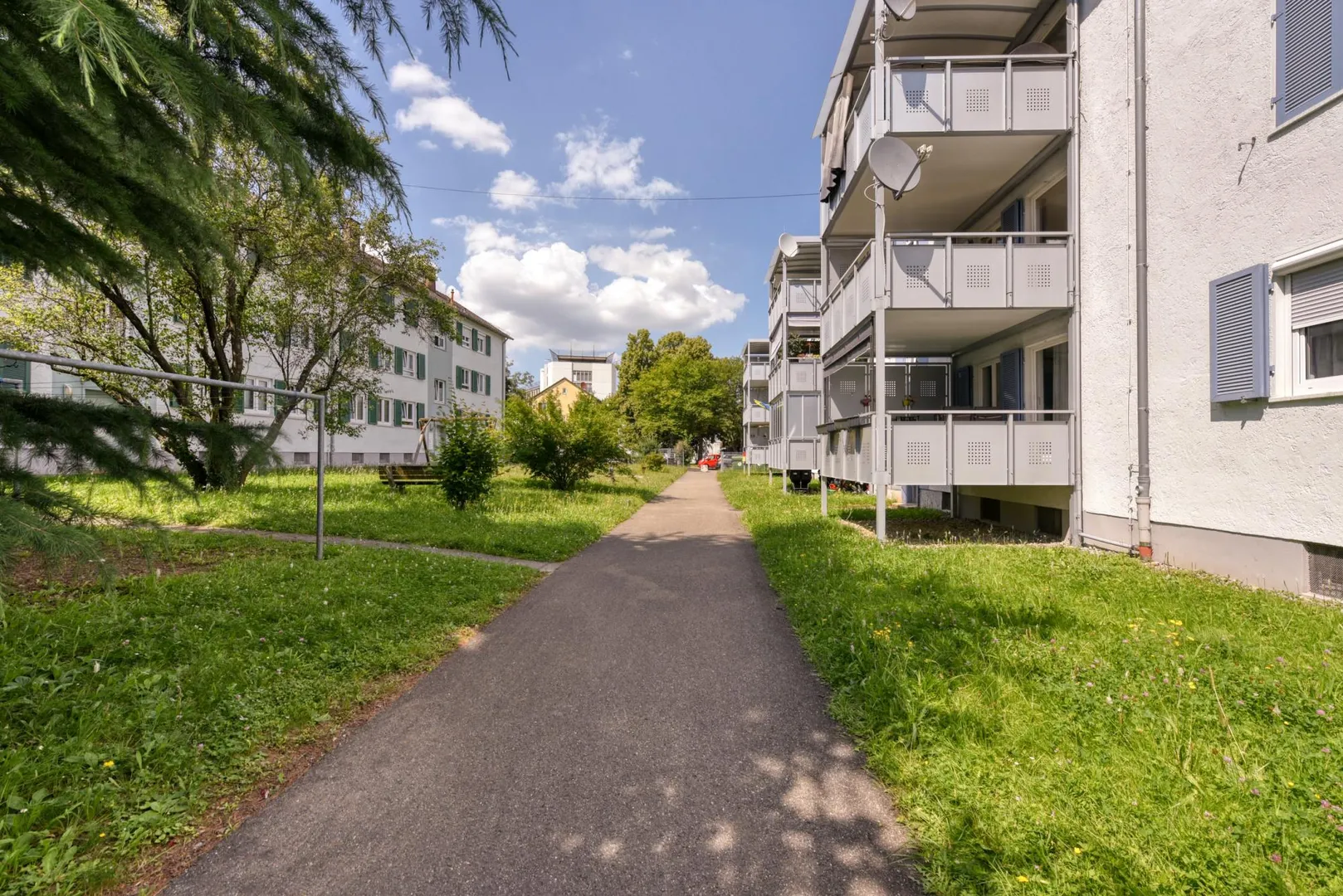 Der Grundriss ist sehr gut: alle Räume sind direkt vom Flur begehbar. Der ca. 11.5 m² große und überdachte Süd/West-Balkon ist über das Wohnzimmer begehbar. Das Badezimmer verfügt über ein Fenster. Das WC mit Fenster ist separat.