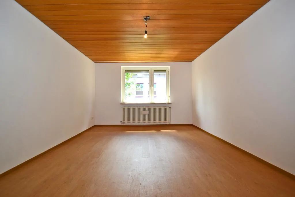 Die Decken im Flur und im Wohnzimmer sind mit braunen Holz-Paneelen ausgestattet. Die Raumhöhen betragen zwischen 2,43 und 2,46 Meter.