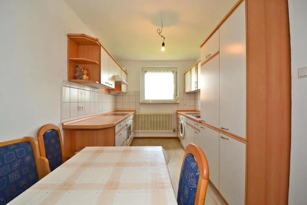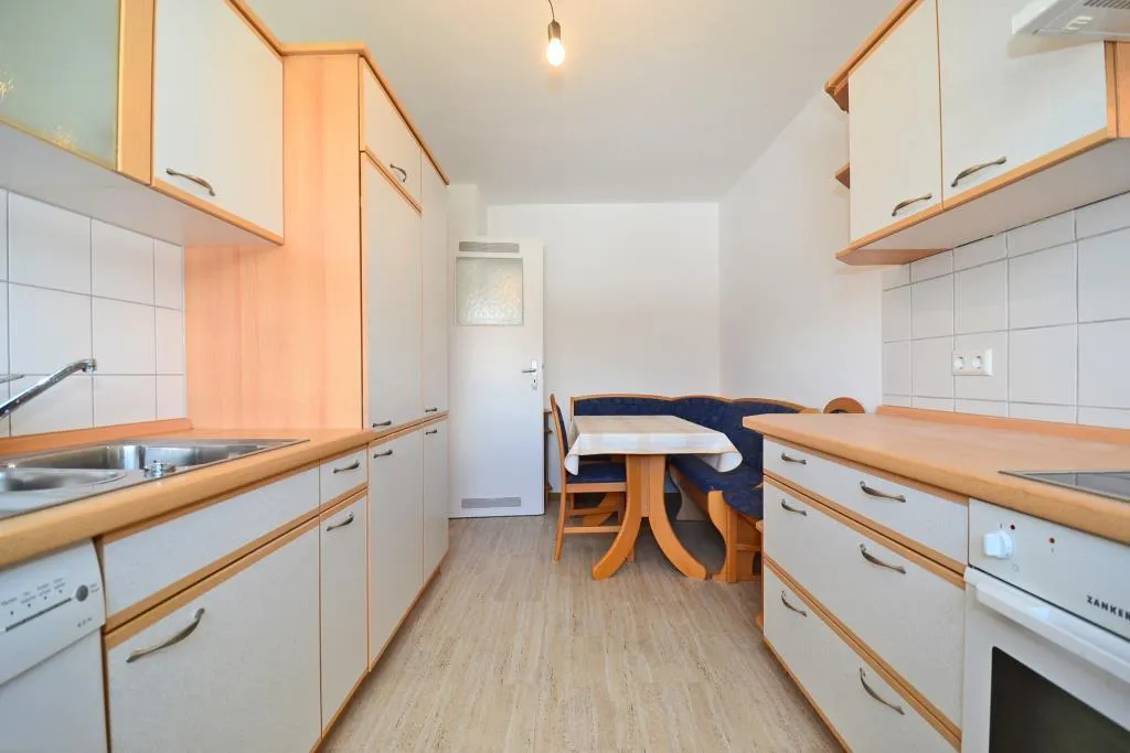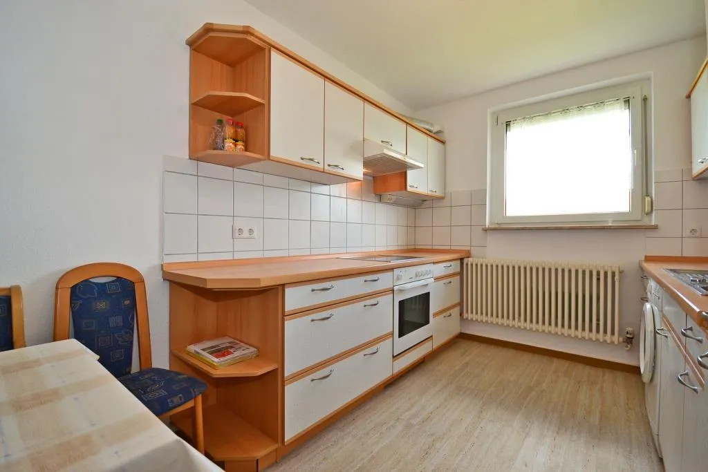 Die Küche ist mit einer Essecke mit Eckbank und Tisch, einem Waschmaschinenanschluss mit Waschmaschine, einem Außenabzug sowie mit einer Einbauküche ausgestattet. Die Einbauküche verfügt über Kühlschrank, Gefrierschrank, Herd mit Backofen sowie Unter- und Oberschränke. Eine Spülmaschine ist nicht vorhanden. Die E-Geräte sind funktionsfähig. Für die künftige Funktionsfähigkeit der E-Geräte übernimmt der Vermieter keine Haftung.