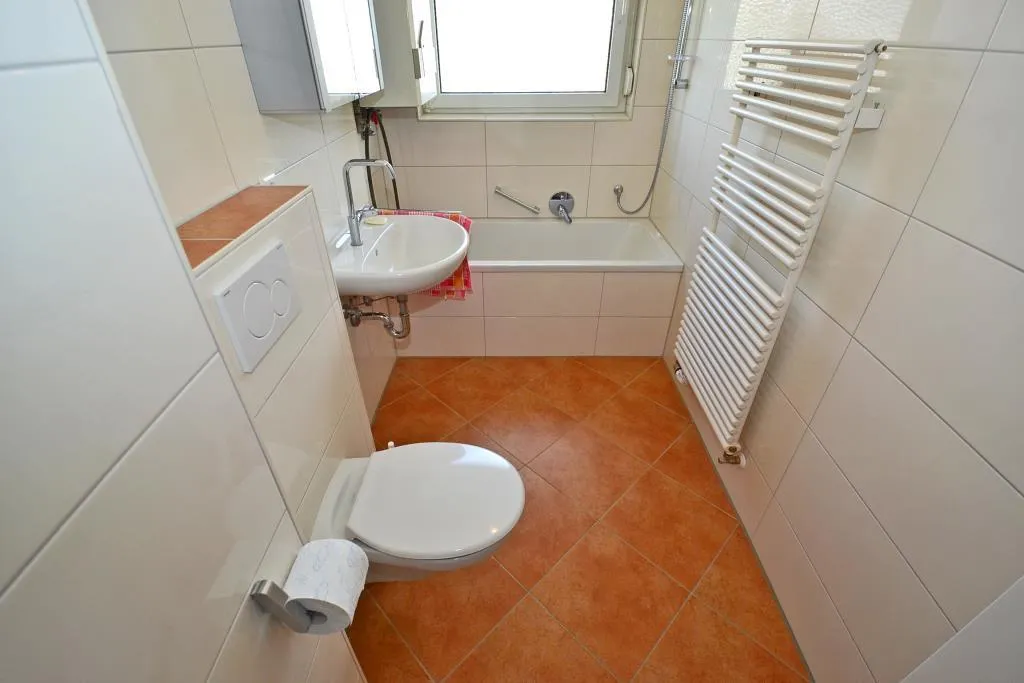 Das raumhoch geflieste Badezimmer mit Fenster ist ausgestattet mit einem Fliesenboden, einer Badewanne, einem WC, einem Handtuch-Heizkörper sowie einem Spiegelschrank.