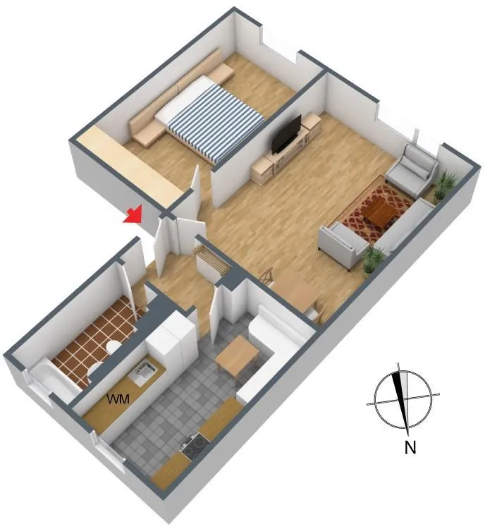 Das Schlafzimmer ist über das Wohnzimmer begehbar. Die Wohnung verfügt über keinen Balkon.