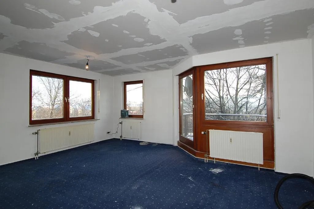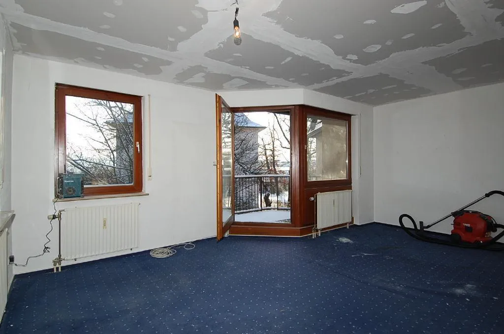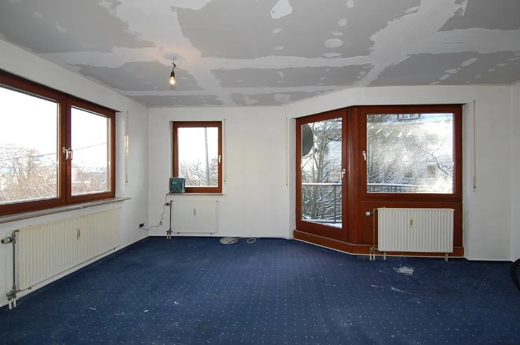 Es wird ein neuer Teppichboden (goldbraun) verlegt und die Holzdecke wird entfernt.