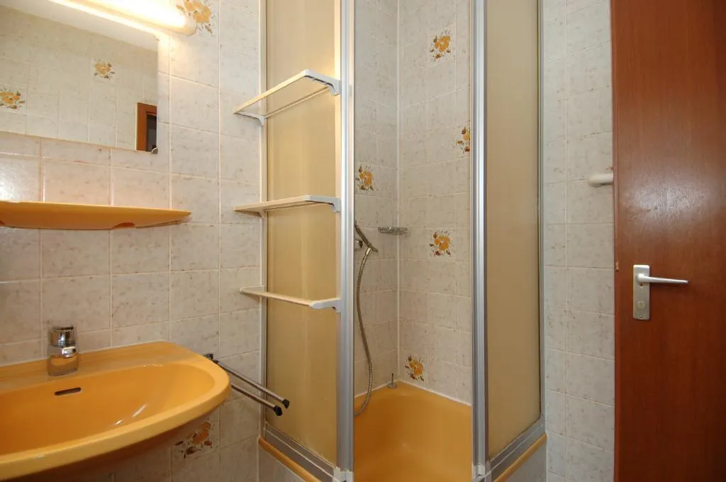 Das Bad ist raumhoch gefliest und mit Fliesenboden, Dusche, Waschbecken, WC und Fenster ausgestattet.