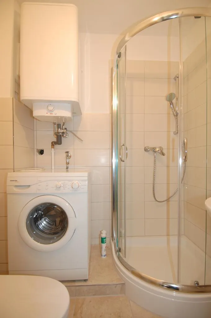 Das Bad ist halbhoch gefliest und ausgestattet mit Fliesenboden und Fußbodenheizung, Dusche, WC und Waschmaschinenanschluss. Eine Waschmaschine ist bereits vorhanden.