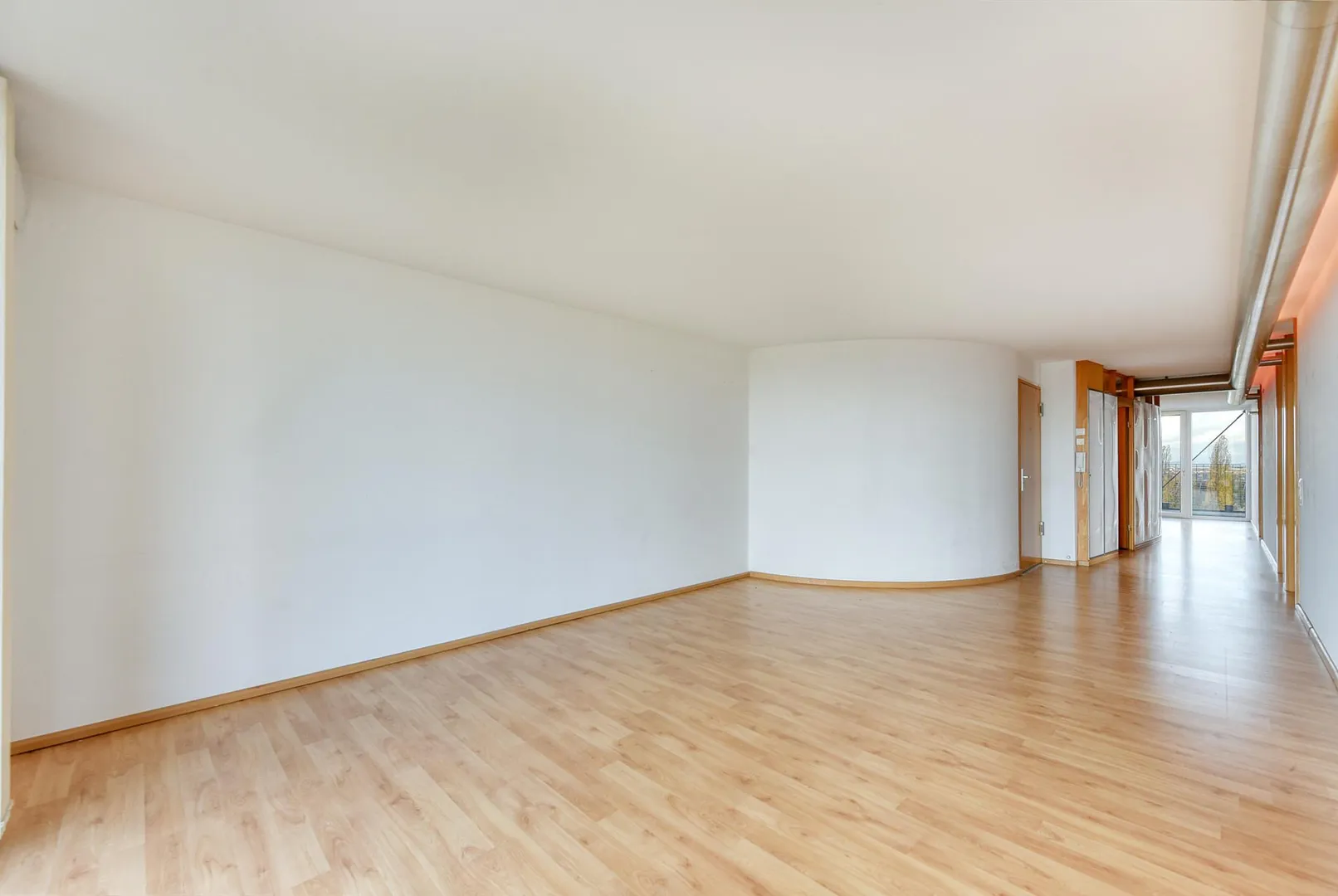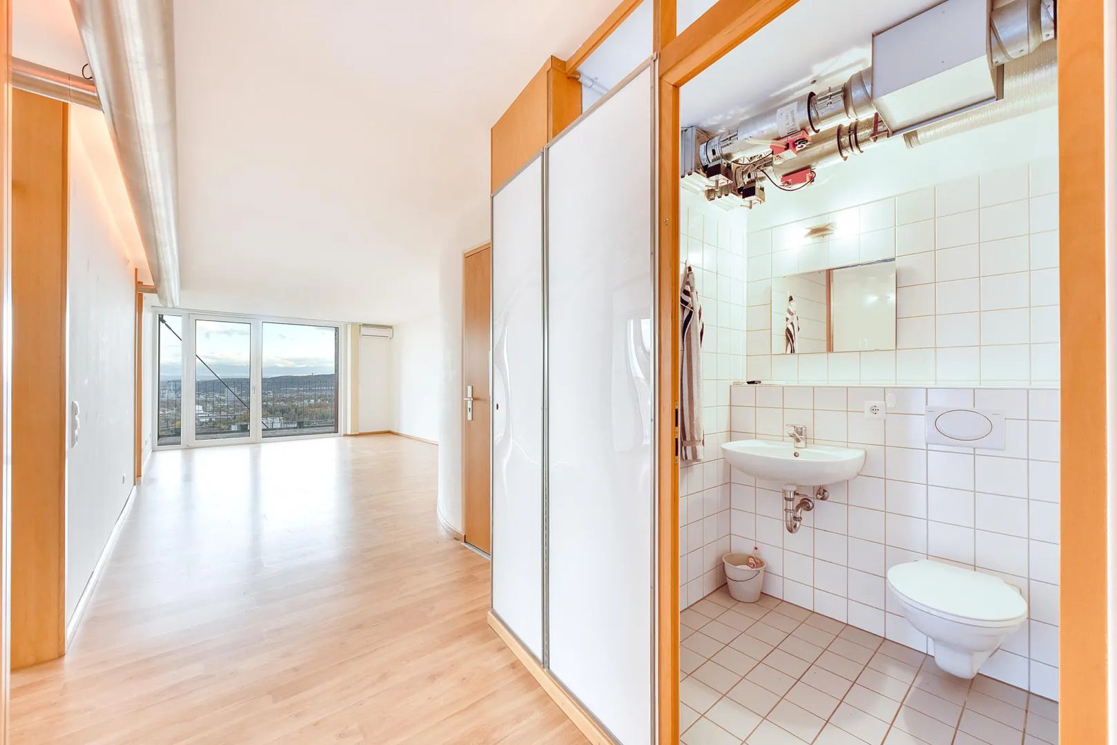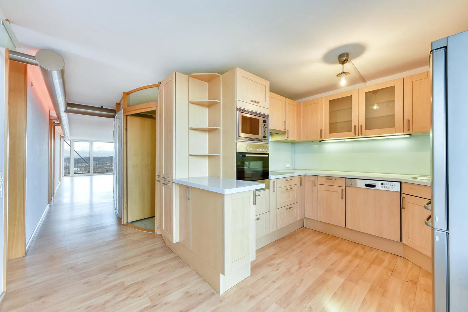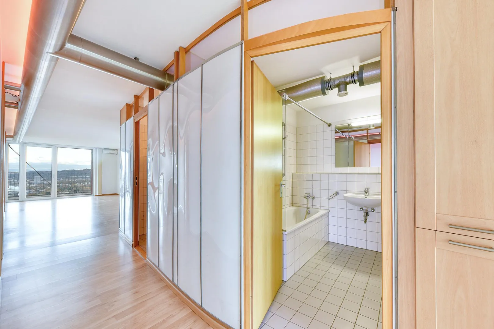 Der offene Flur geht über die komplette Wohnungslänge vom offenen Wohn-/Essbereich auf der Süd/Ost-Hausseite zum offenen Küchenbereich auf der Nord/West-Hausseite. Dadurch kann man quasi durch die komplette Wohnungslänge, von einem Balkon zum anderen sehen.