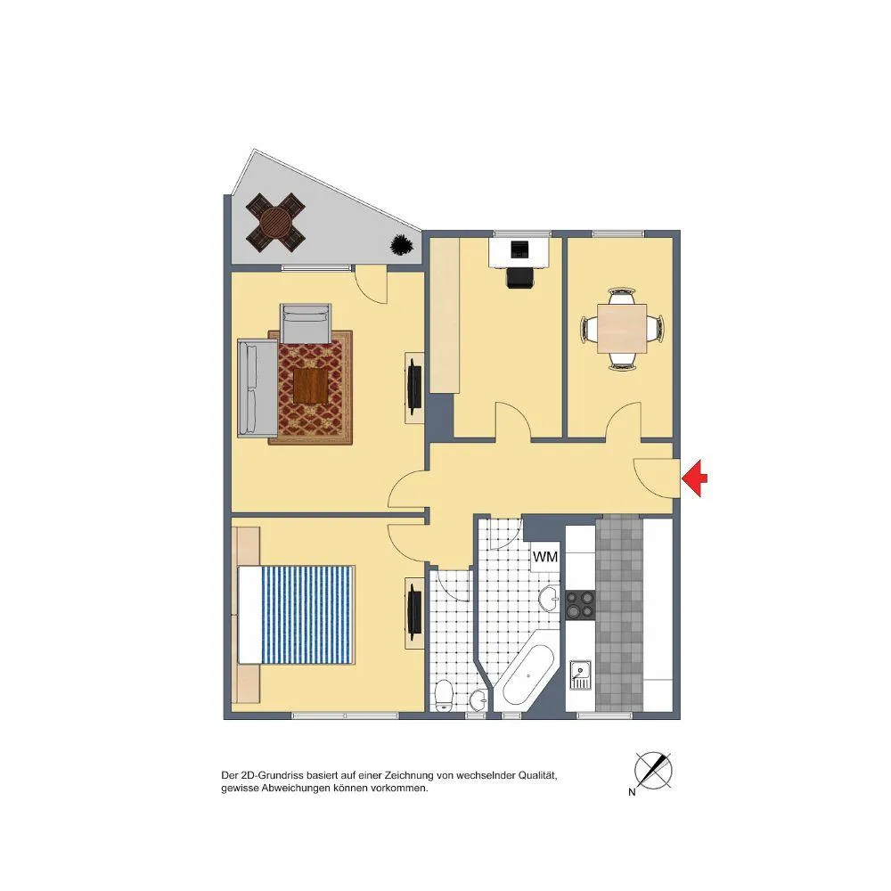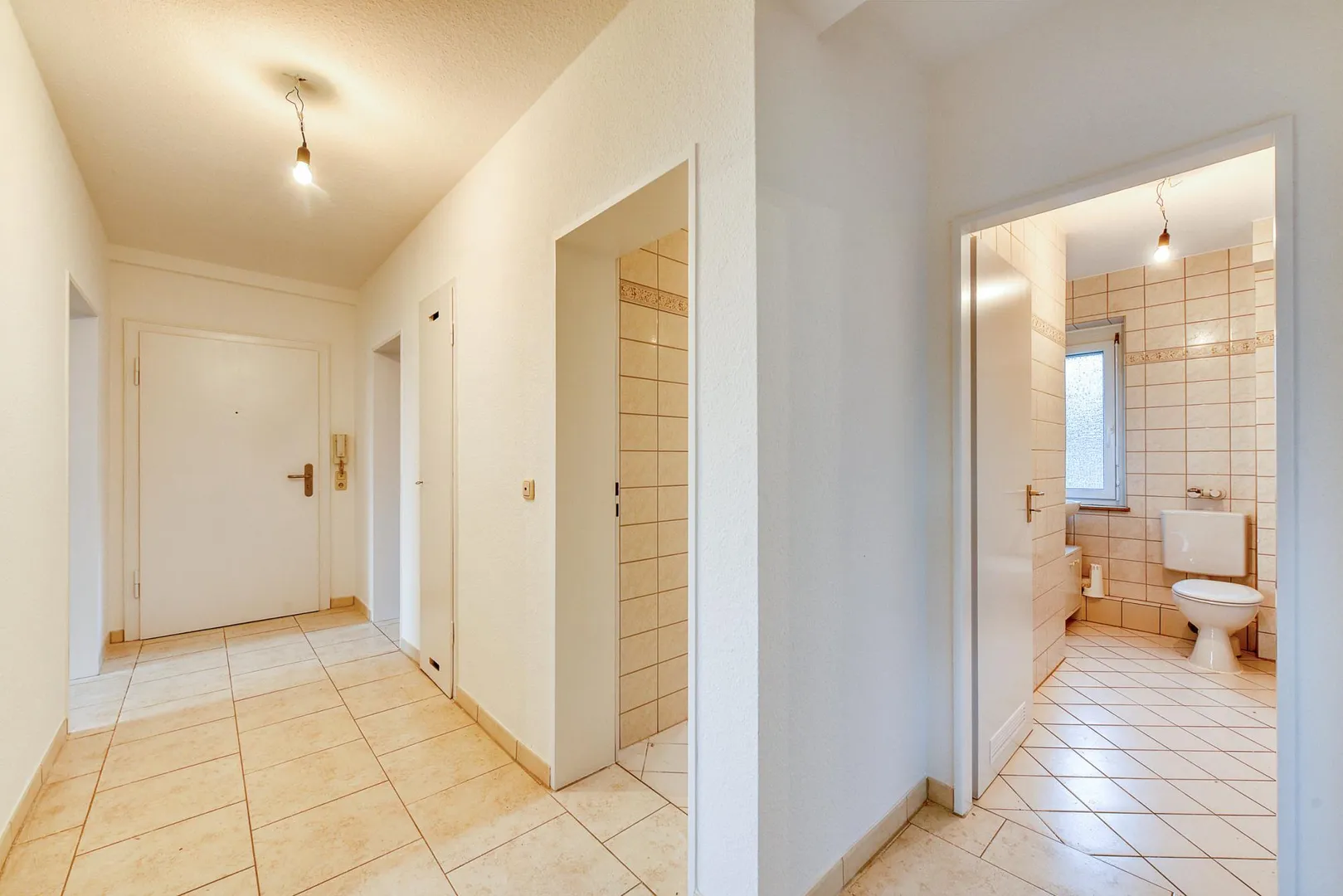 Der Grundriss ist sehr gut: alle Räume sind direkt vom Flur begehbar. Der ca. 7,5 m² große und überdachte Balkon ist über das Wohnzimmer begehbar. Das Badezimmer verfügt über ein Fenster. Das WC mit Fenster ist separat.