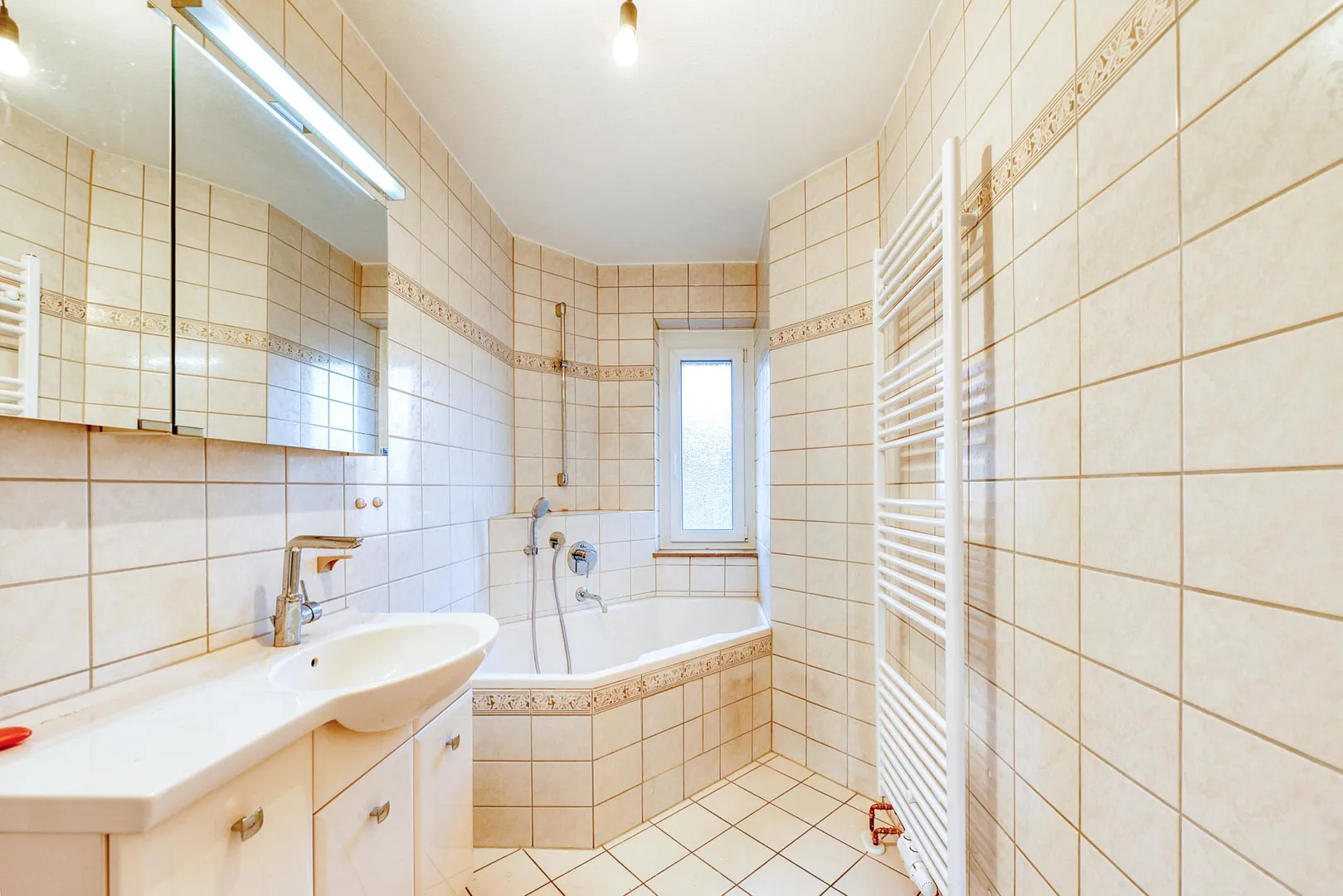 Das raumhoch geflieste Tageslicht-Badezimmer ist ausgestattet mit einer Eck-Badewanne, einen Fliesenboden, einen Handtuch-Heizkörper, einen Waschmaschinen-Anschluss, einen Waschtisch-Unterschrank sowie einen belichteten Spiegelschrank.