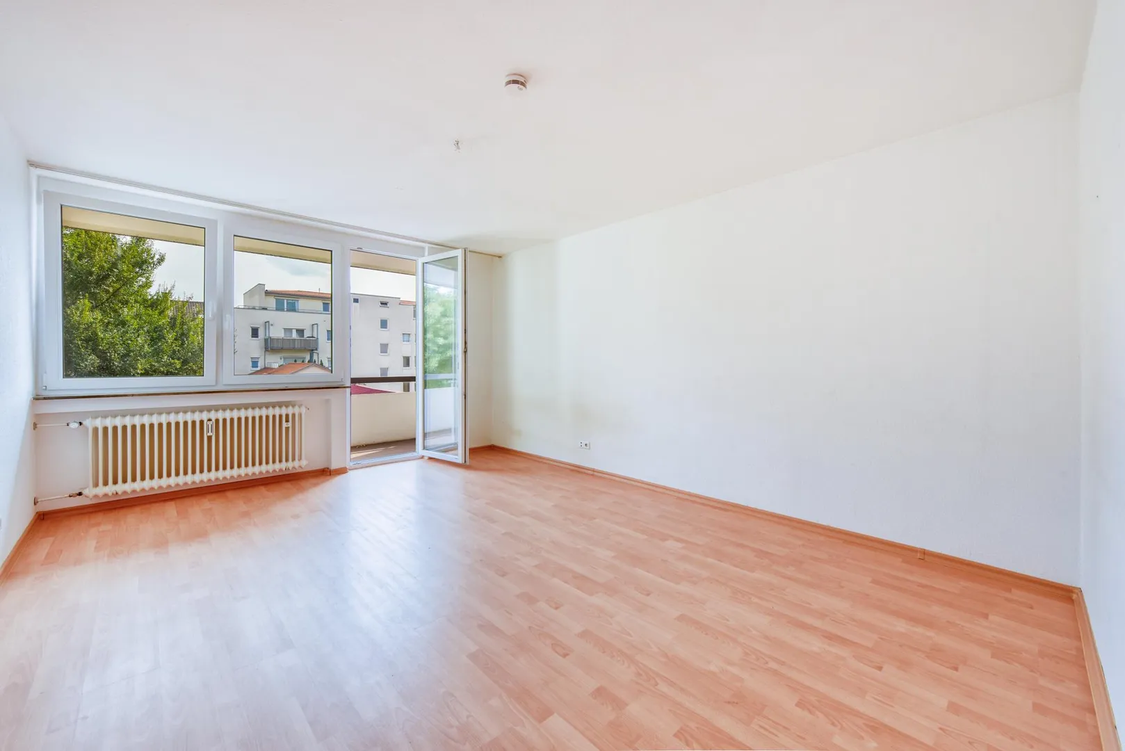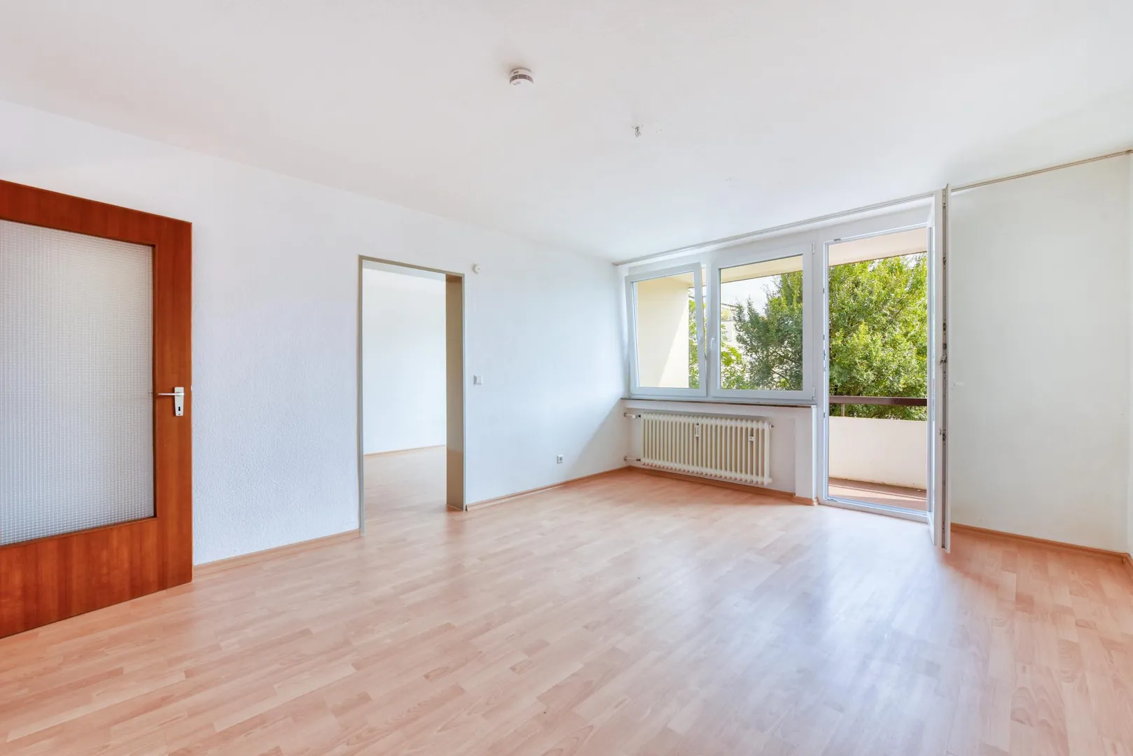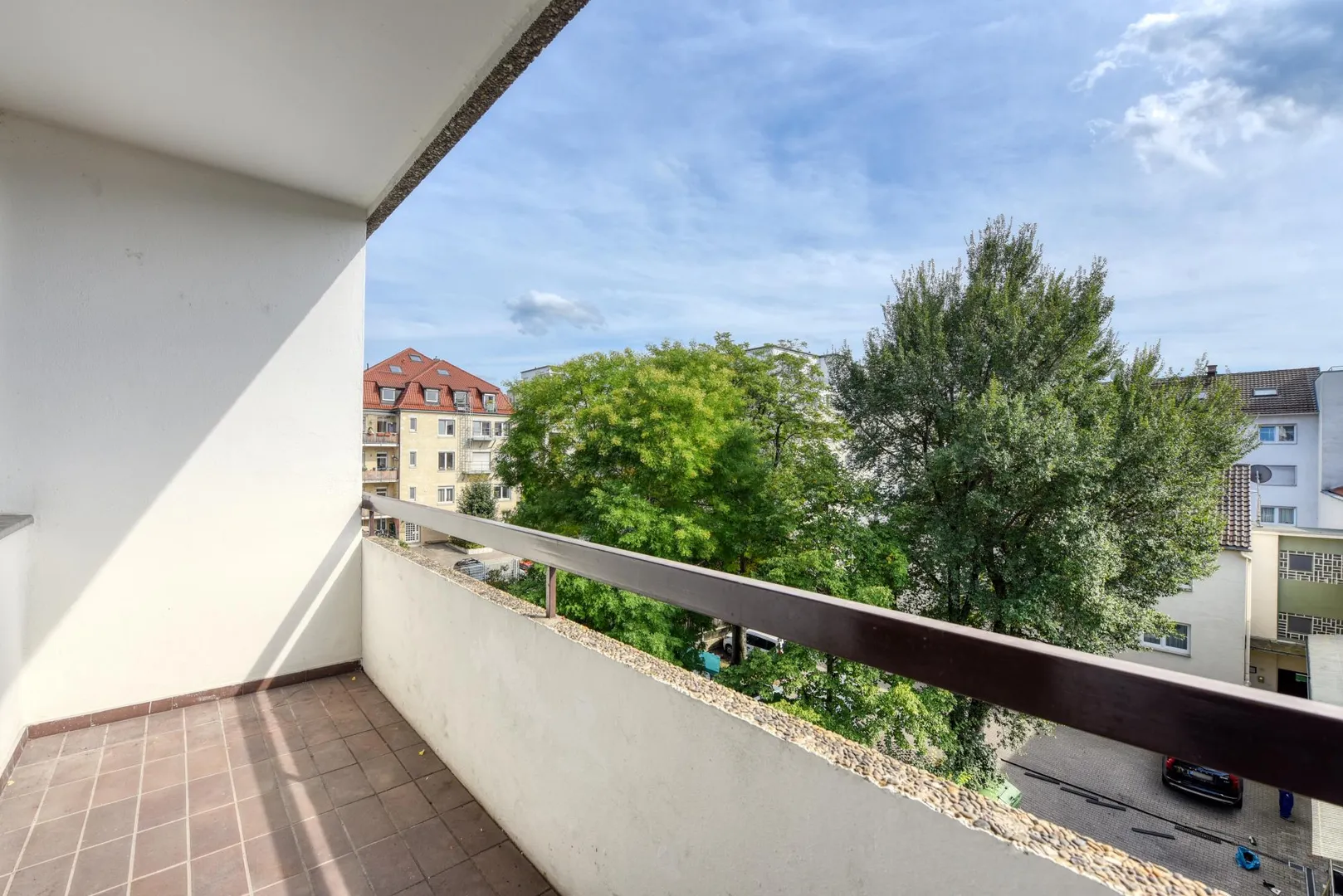 Der ca. 4,5 m² große und überdachte Balkon ist über das Wohnzimmer begehbar.