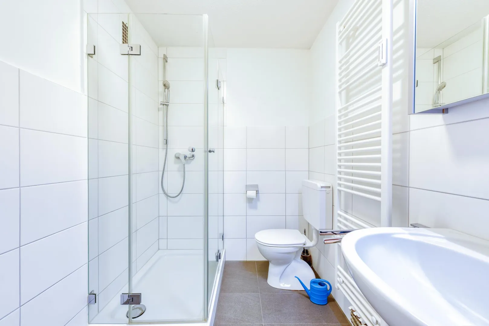 Das teilweise halbhoch und teilweise raumhoch geflieste Badezimmer ist ausgestattet mit einer Dusche, einem WC, einem Handtuch-Heizkörper, einem Spiegelschrank und einem Waschmaschinenanschluss.