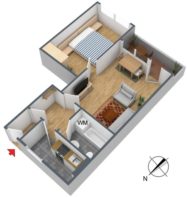 Die Einbauküche verfügt über einen Kühlschrank mit Gefrierfach, einen Herd mit Backofen sowie Unter- und Oberschränke. Eine Spülmaschine ist nicht vorhanden. Für die künftige Funktionsfähigkeit der E-Geräte übernimmt der Vermieter keine Haftung.