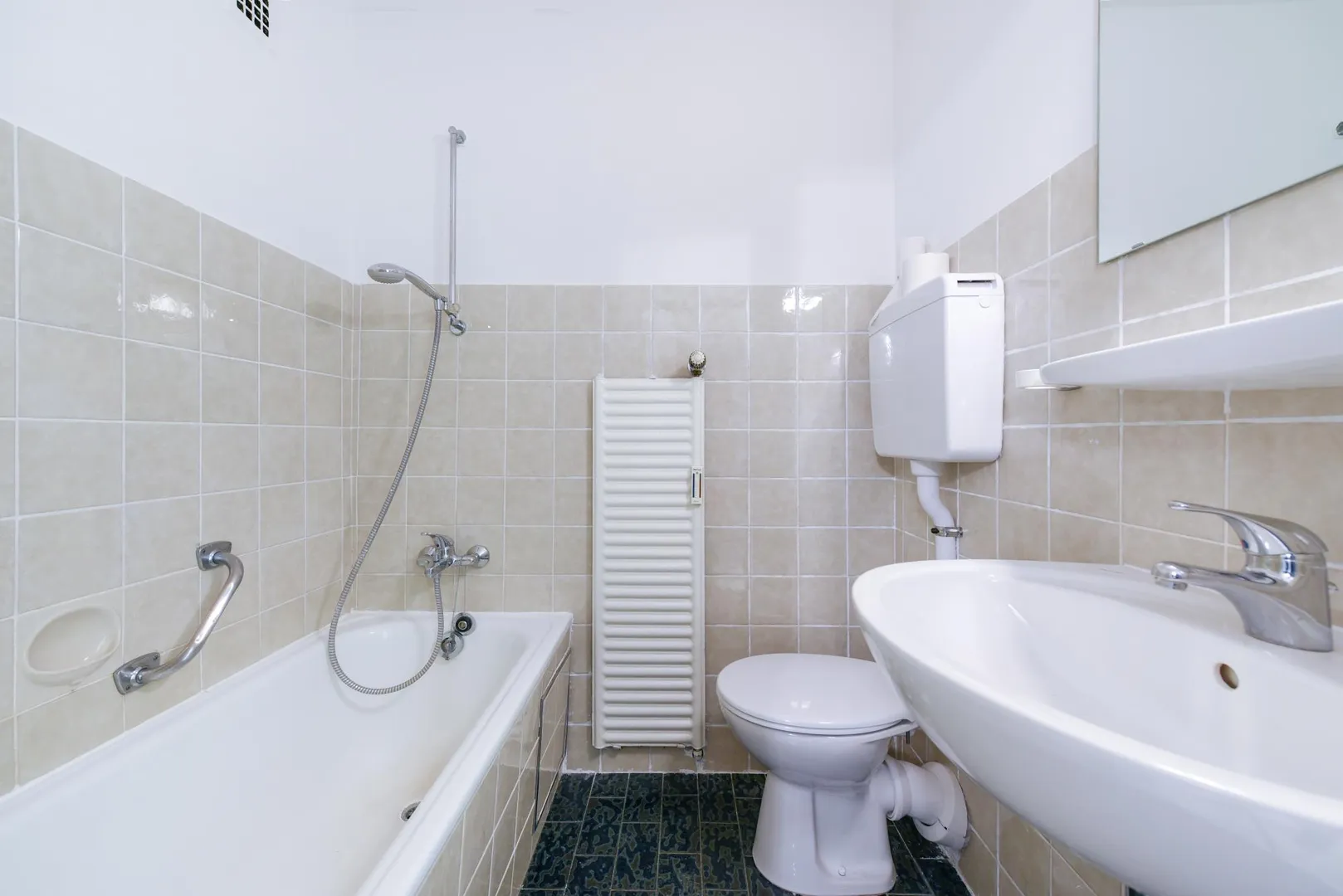 Das halbhoch geflieste Badezimmer ist mit einem Fliesenboden, einer Badewanne, einem WC sowie einem Spiegel ausgestattet.