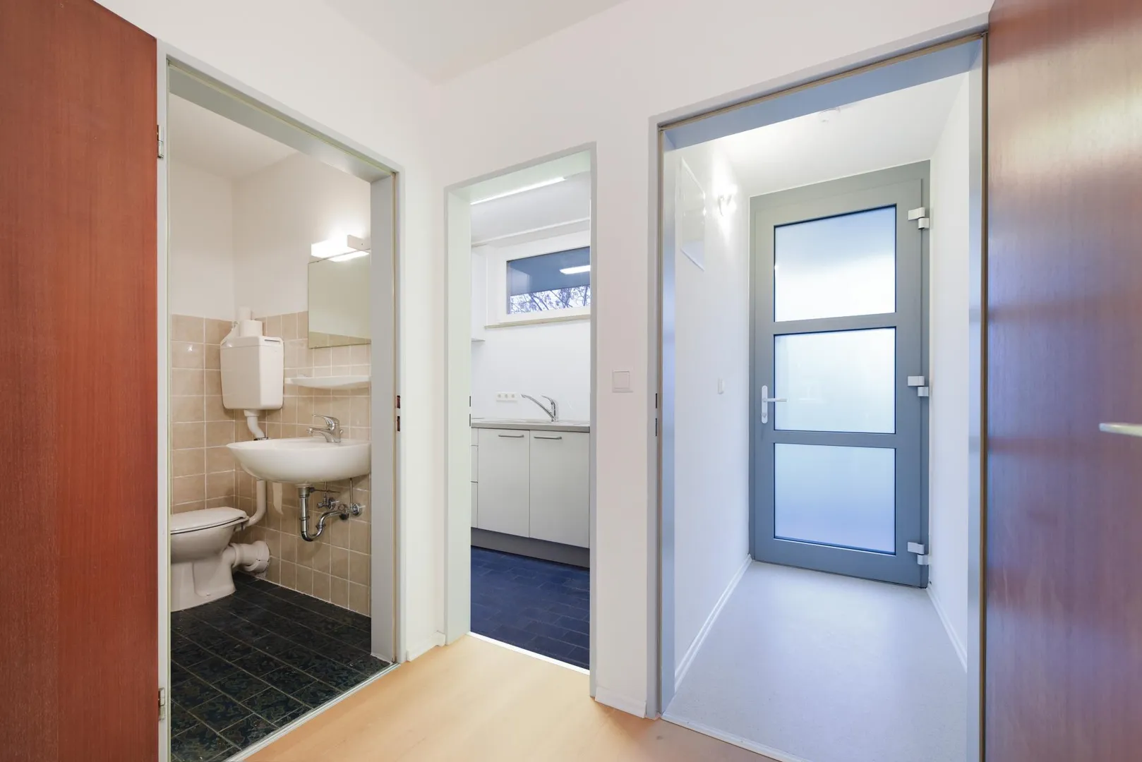 Aktuell wurden im Flur und im Zimmer ein neuer Laminat-Boden verlegt. Die Wände sind mit Raufasertapeten tapeziert und wurden frisch, weiß gestrichen.