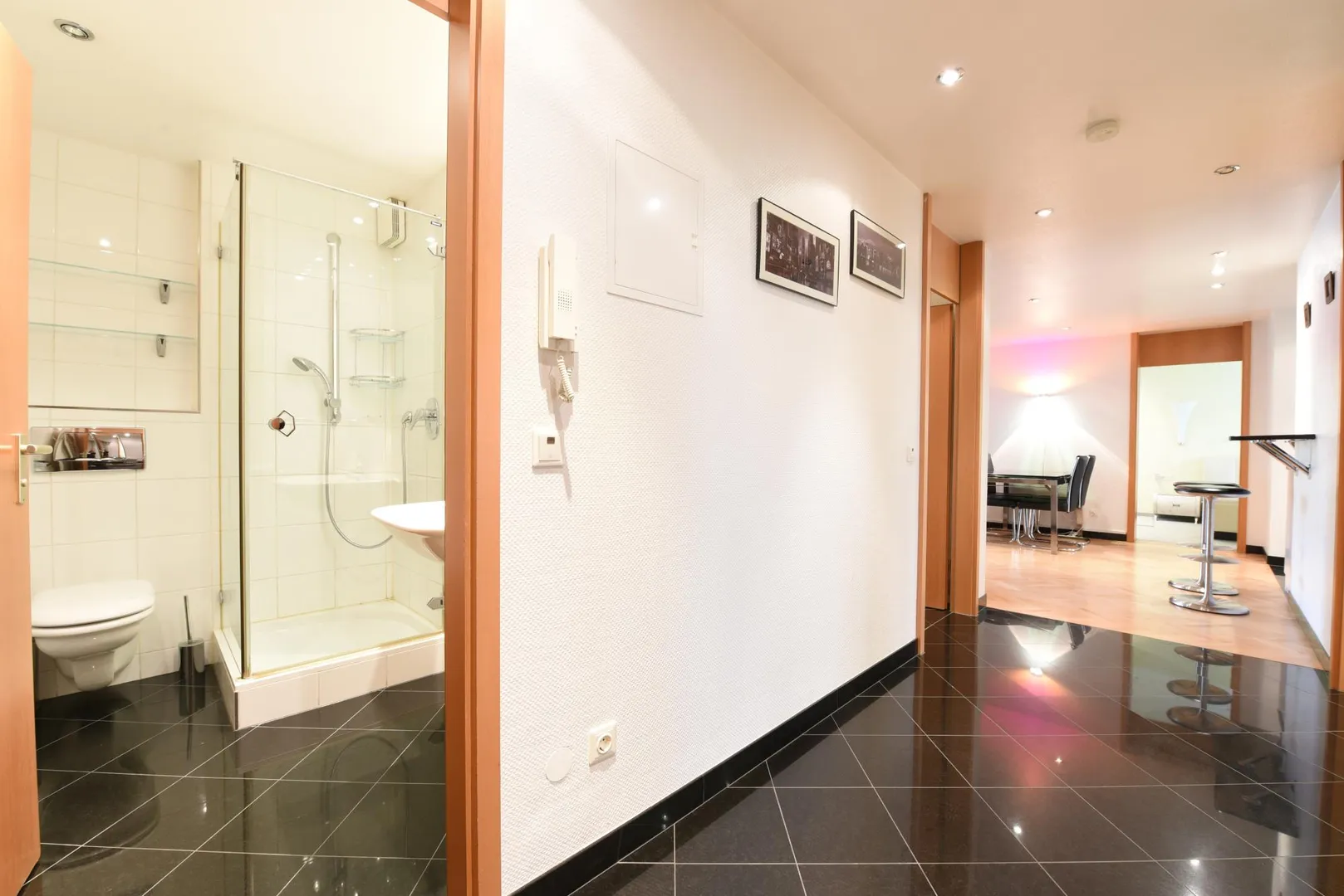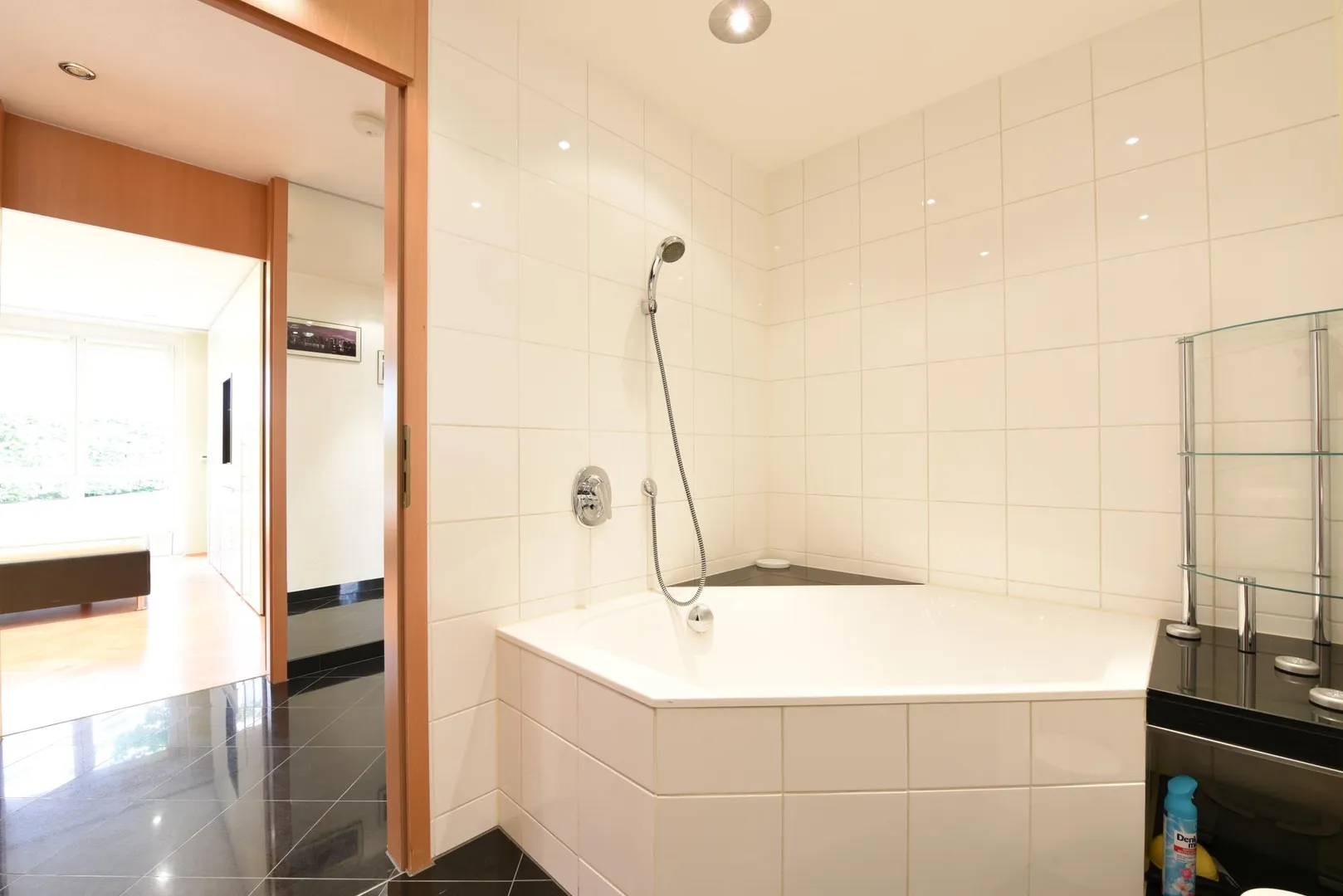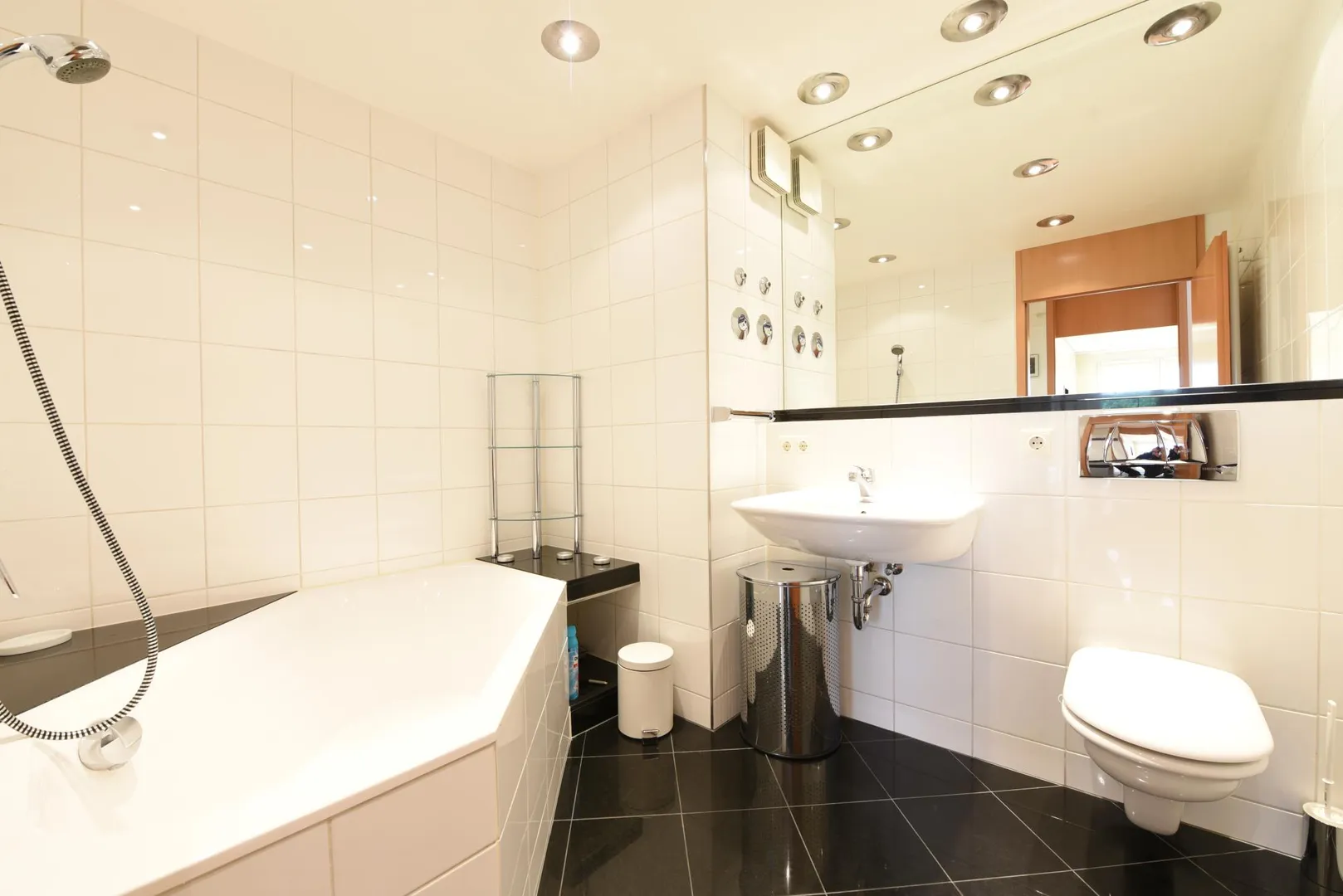 Die Wohnung verfügt über zwei Bäder. Das größere Badezimmer ist mit einer Eck-Badewanne, einem Waschbecken, einem WC sowie einem Handtuchheizkörper ausgestattet. Das kleinere Badezimmer verfügt über eine Dusche, ein Waschbecken, ein WC sowie einen Handtuchheizkörper.