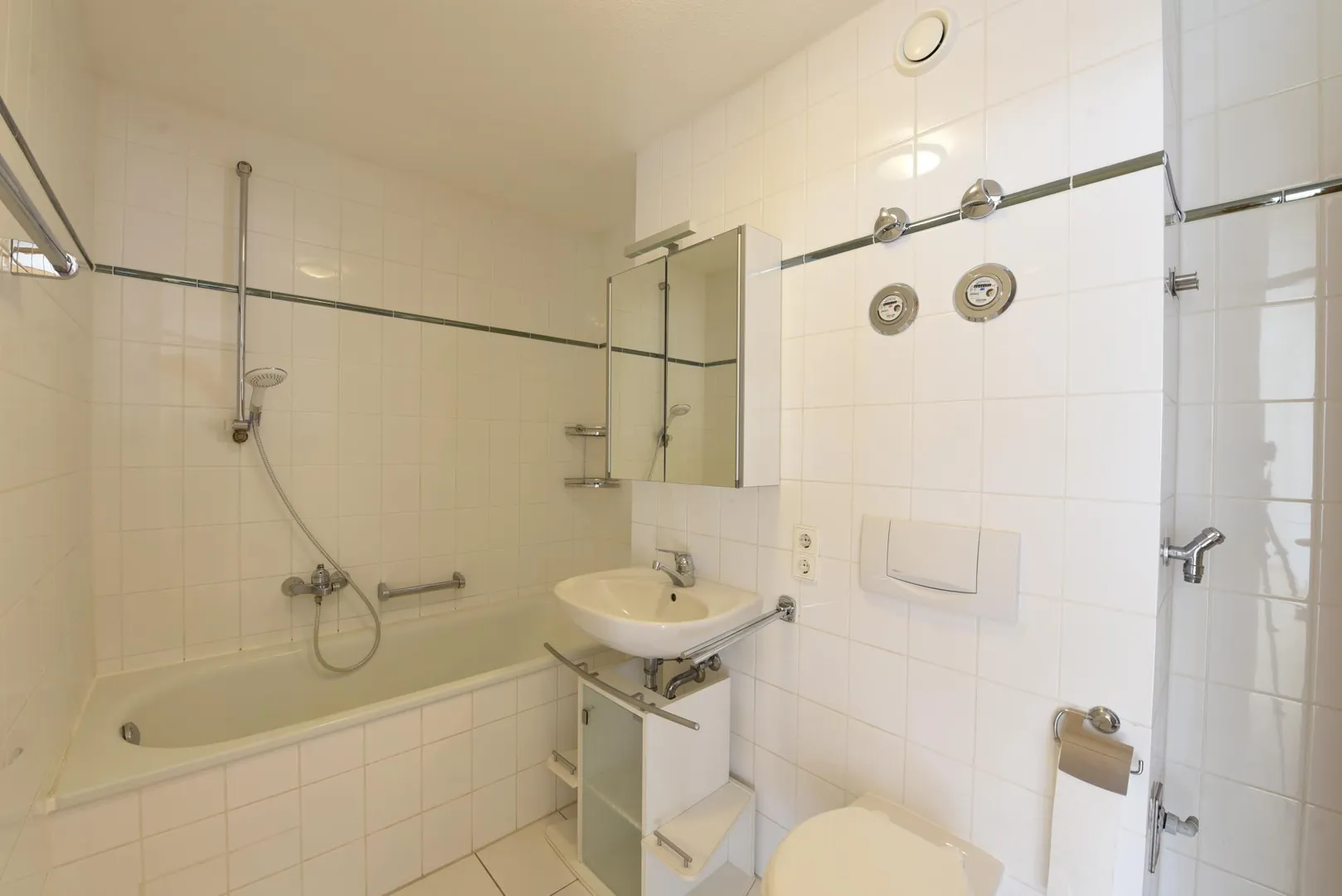Das Badezimmer ist raumhoch gefliest und ist ausgestattet mit einer Wanne und einem Waschmaschinen-/Trockneranschluss.