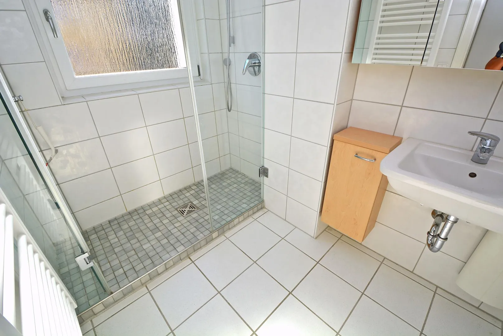Das raumhoch geflieste Tageslicht-Bad ist ausgestattet mit einer bodentiefen Dusche, einem Spiegelschrank und einem kleinen Unterschrank sowie einem Handtuchheizkörper.