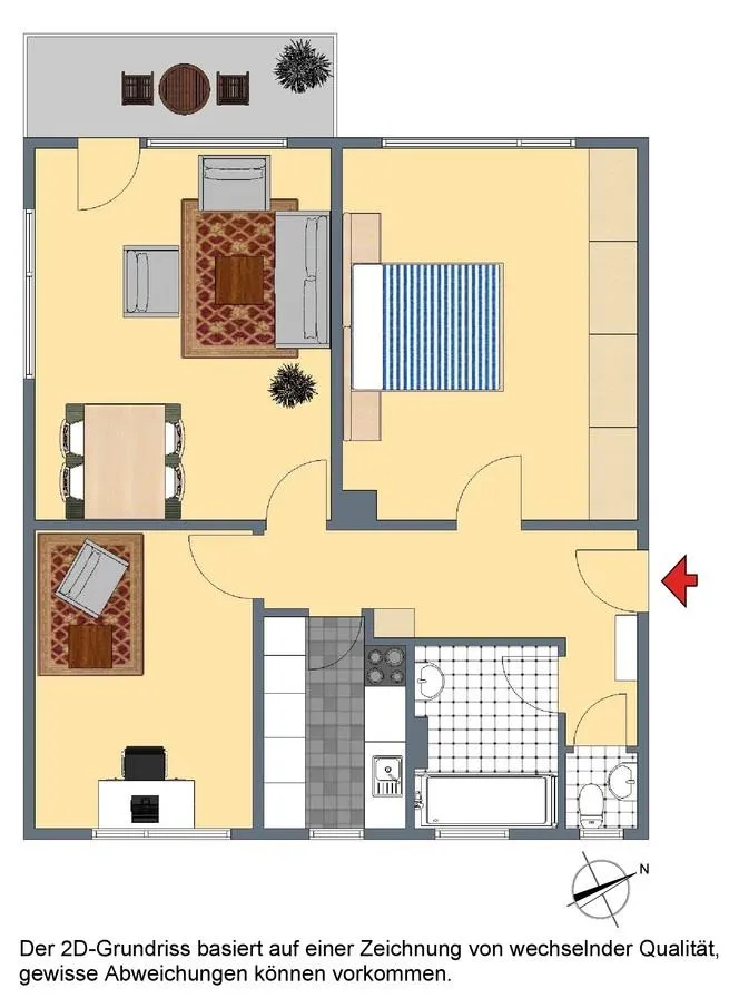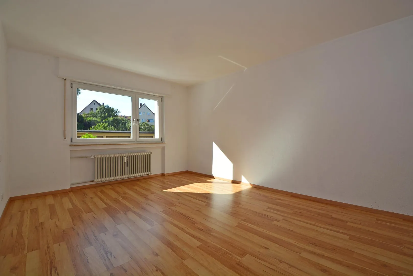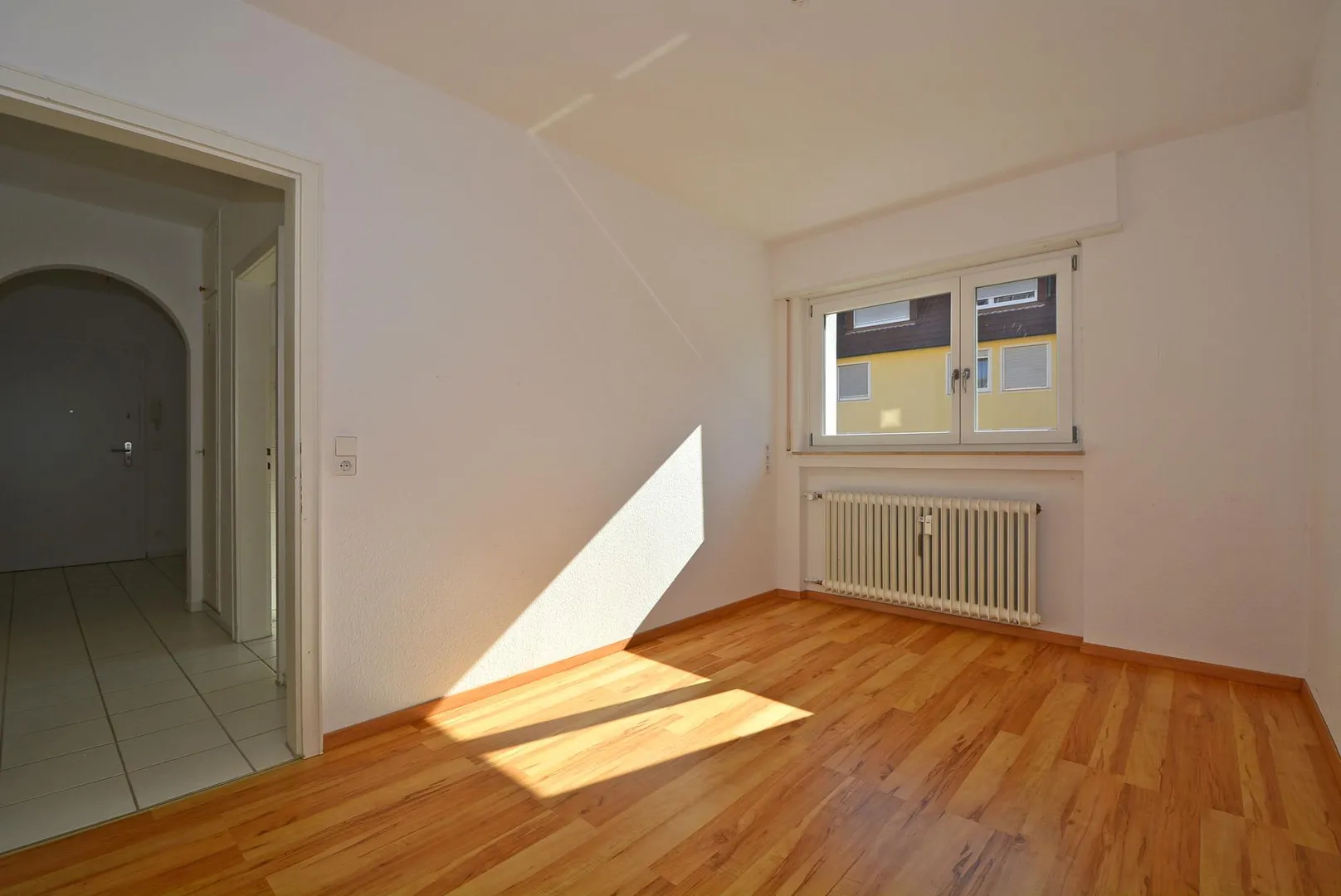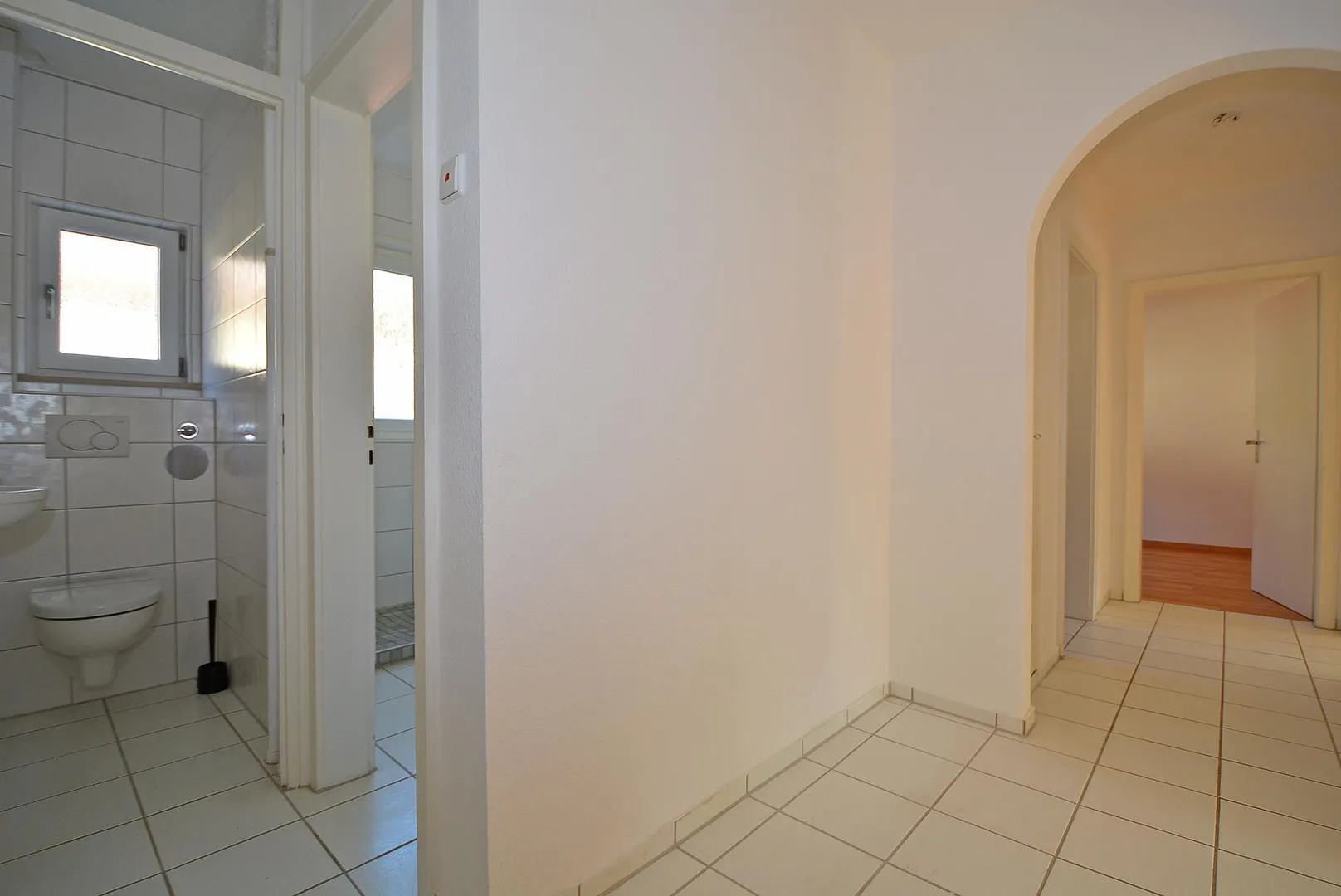 Der Grundriss ist sehr gut. Alle Räume sind vom Flur begehbar. Das Badezimmer verfügt über ein Fenster. Das WC mit Fenster ist separat. Der überdachte, ca. 6 m² große West-Balkon ist über das Wohnzimmer begehbar.