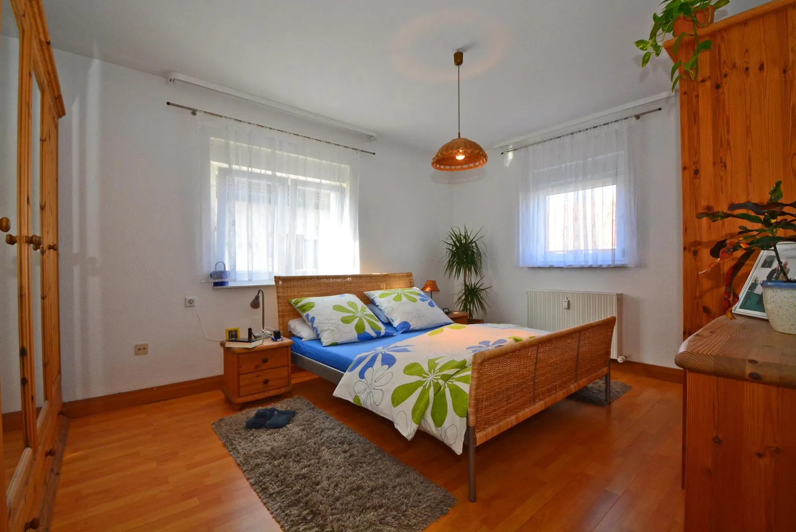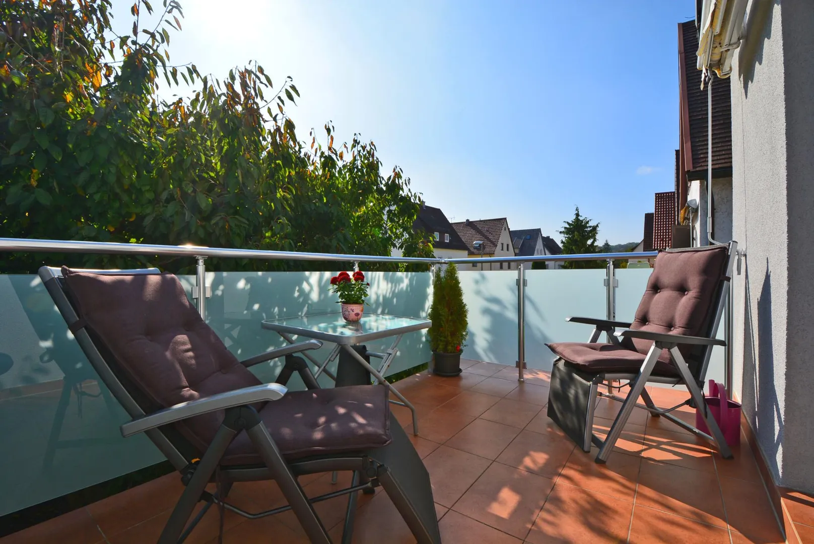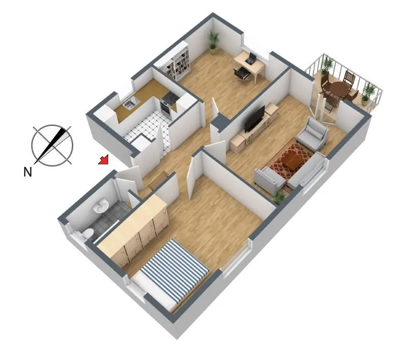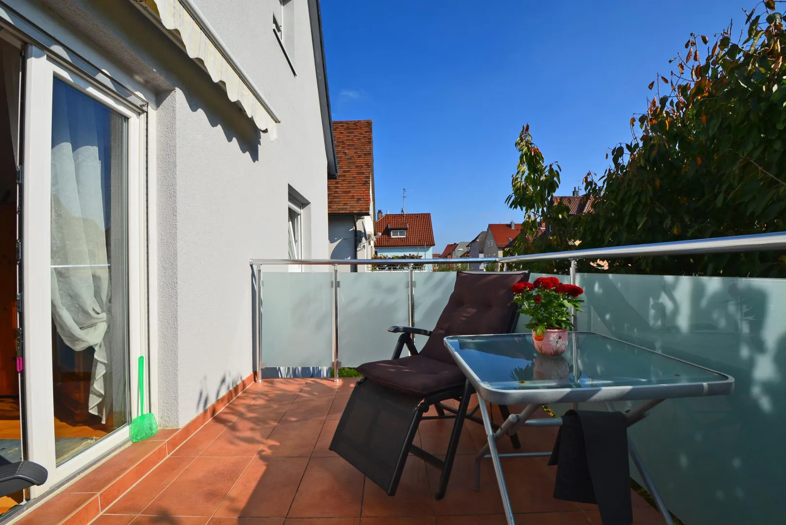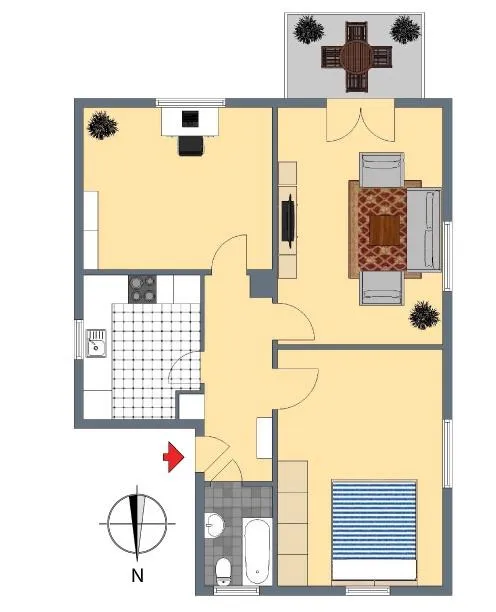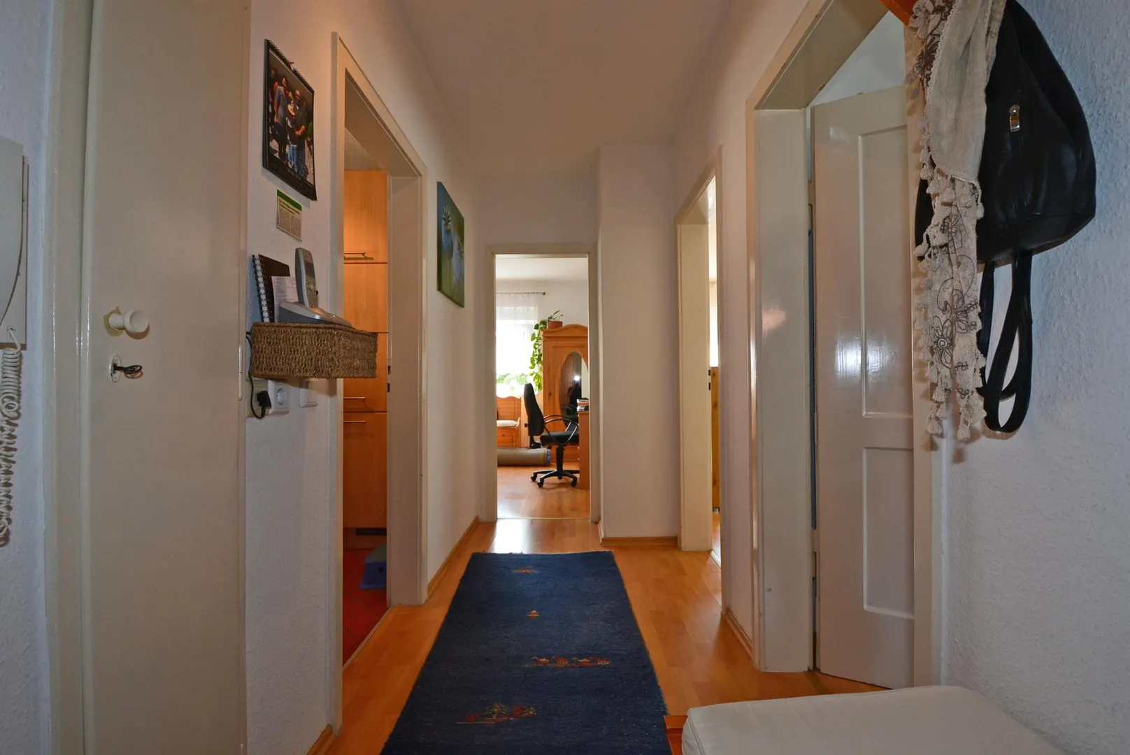 Alle Räume sind vom Flur aus zugänglich. Das Badezimmer ist mit einem Fenster ausgestattet. Der Süd-Balkon ist mit einer Markise ausgestattet und über das Wohnzimmer begehbar.