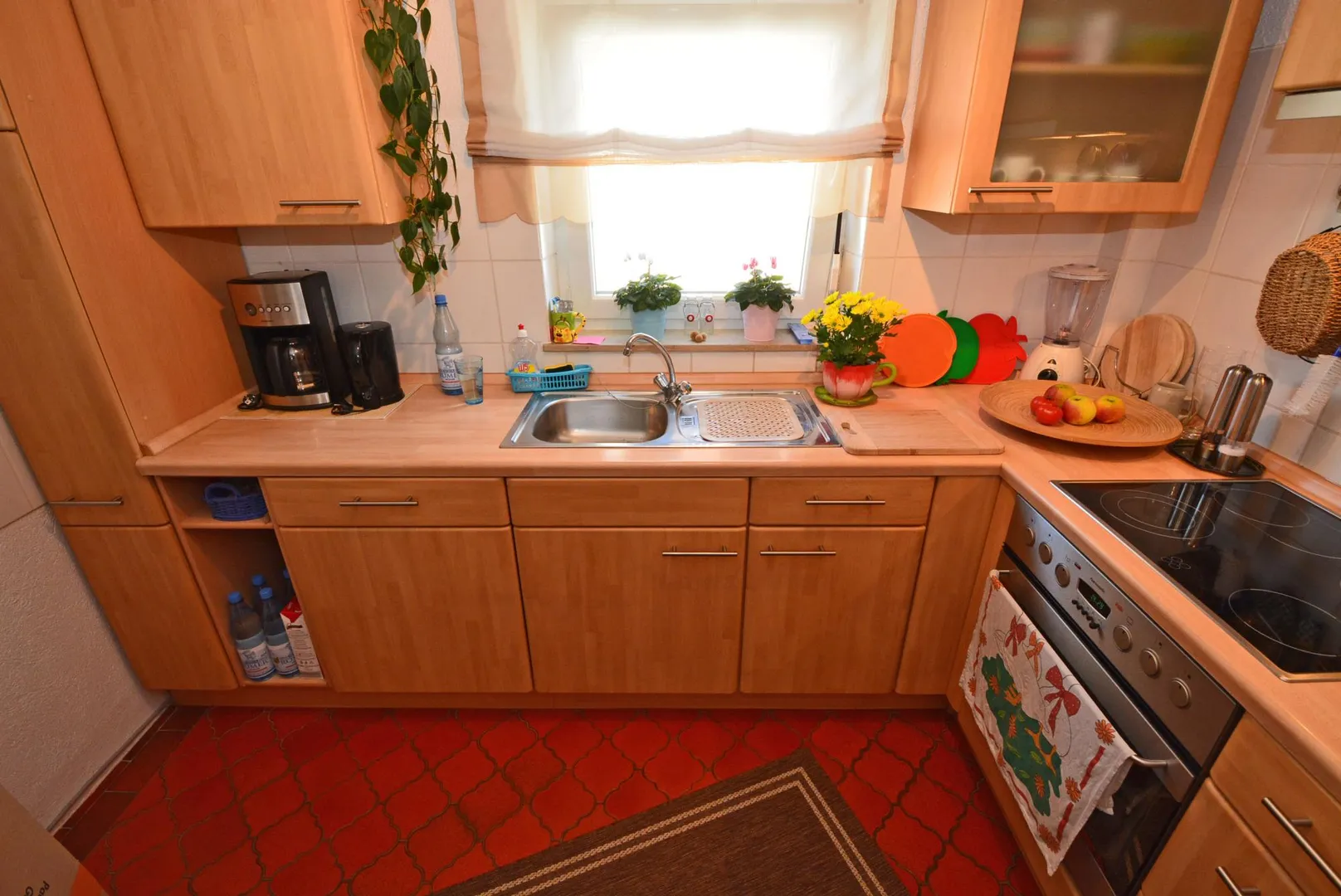 Die Einbauküche ist ausgestattet mit einer Spülmaschine, einem Herd mit Dunstabzug, einem Backofen, einen Kühlschrank mit Gefrierfach sowie Ober- und Unterschränken.