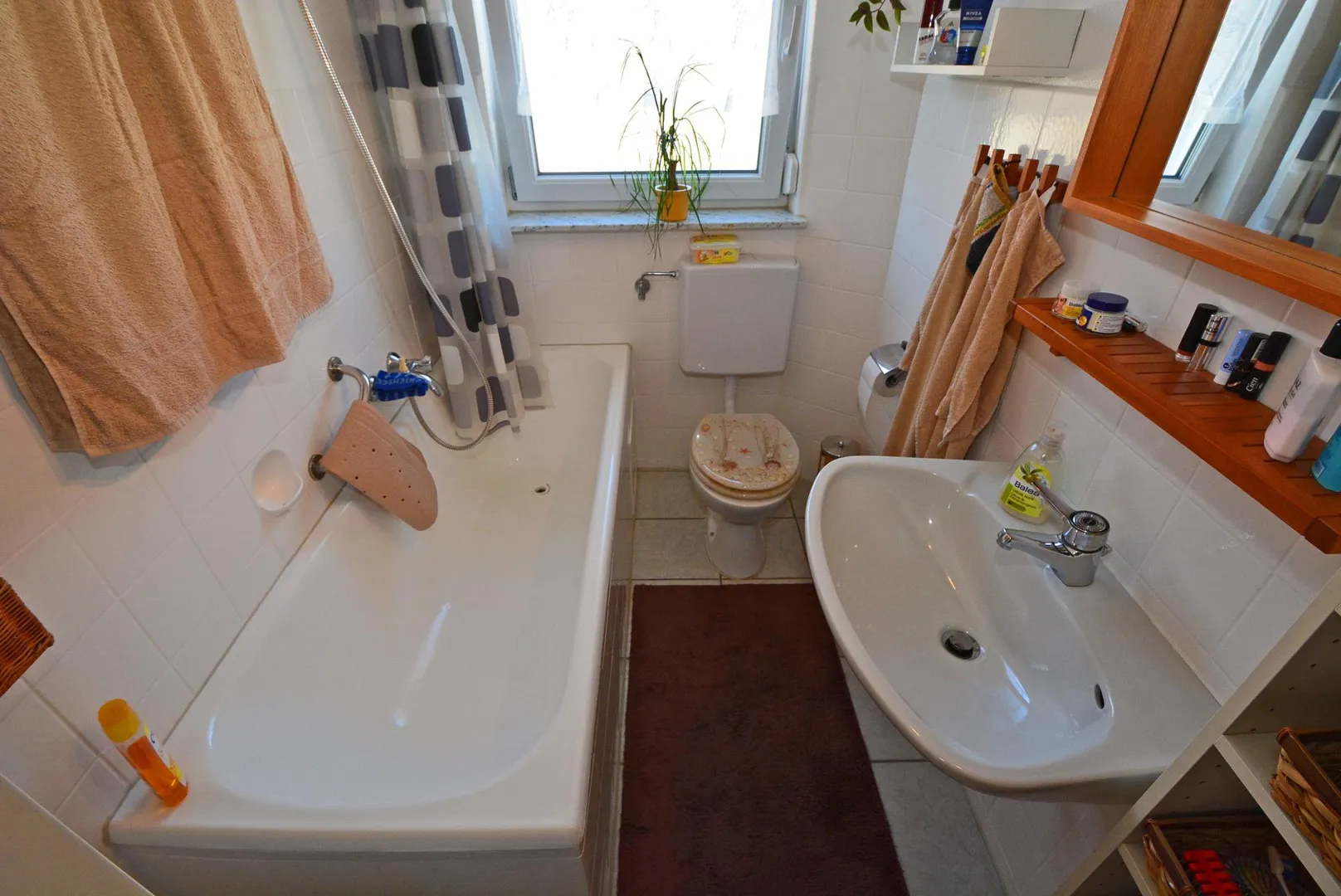 Das halbhoch geflieste Tageslicht-Badezimmer wird neu gefliest und mit einer Wellnessdusche und einem WC ausgestattet.