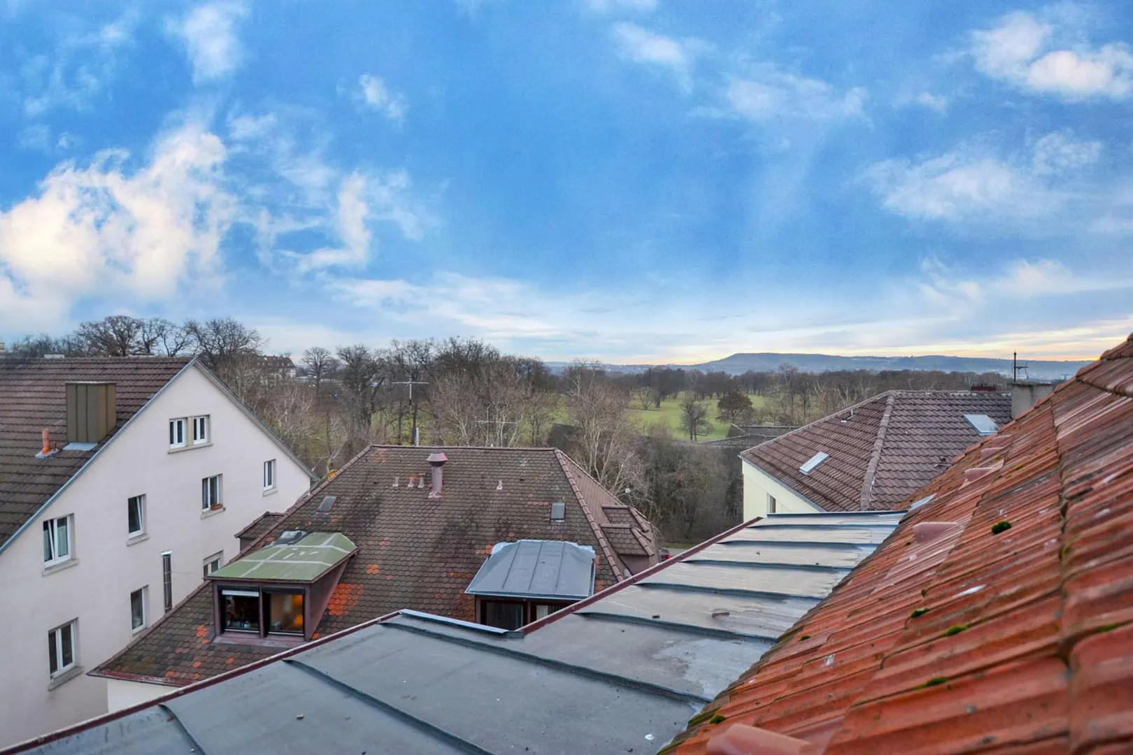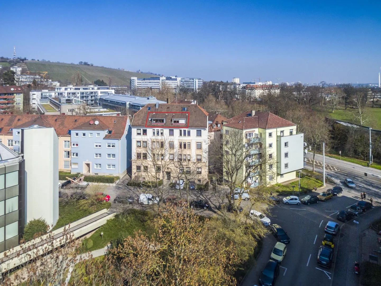 Vom Dachfenster im Schlafzimmer gibt es einen Fernblick zu den Weinbergen am Pragsattel und über den herrlichen Rosensteinpark bis nach Bad Cannstatt und Fellbach.
