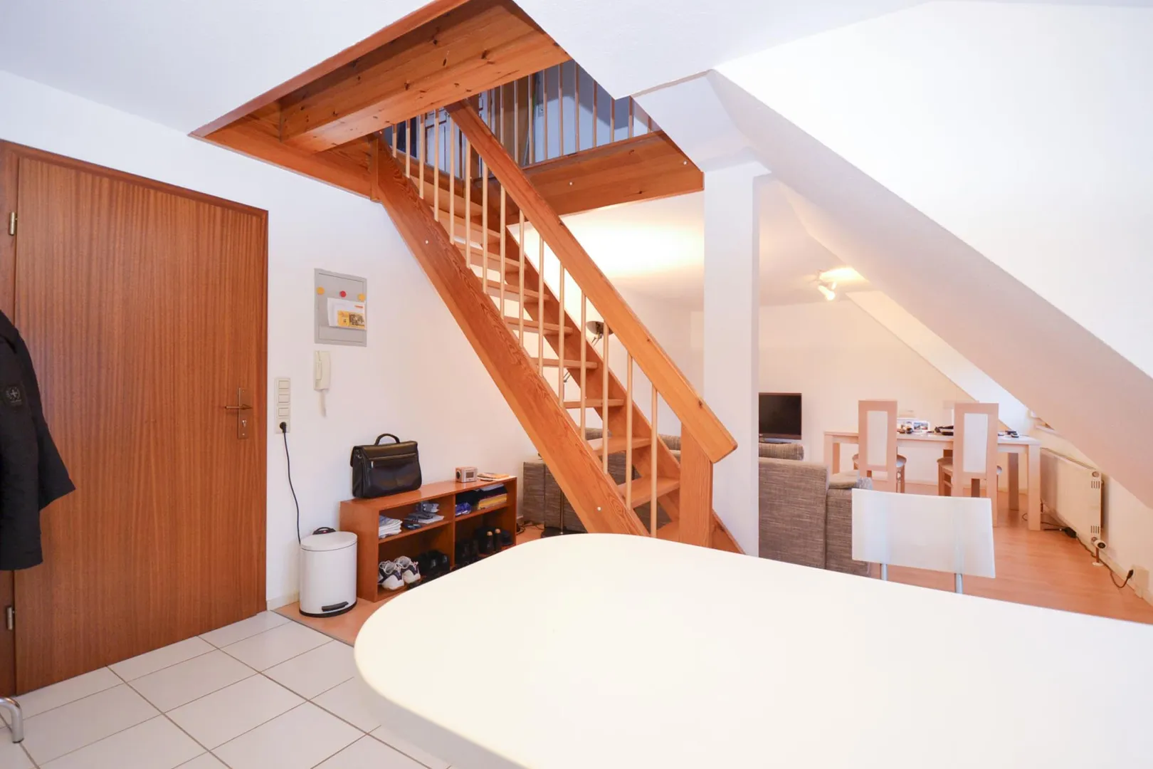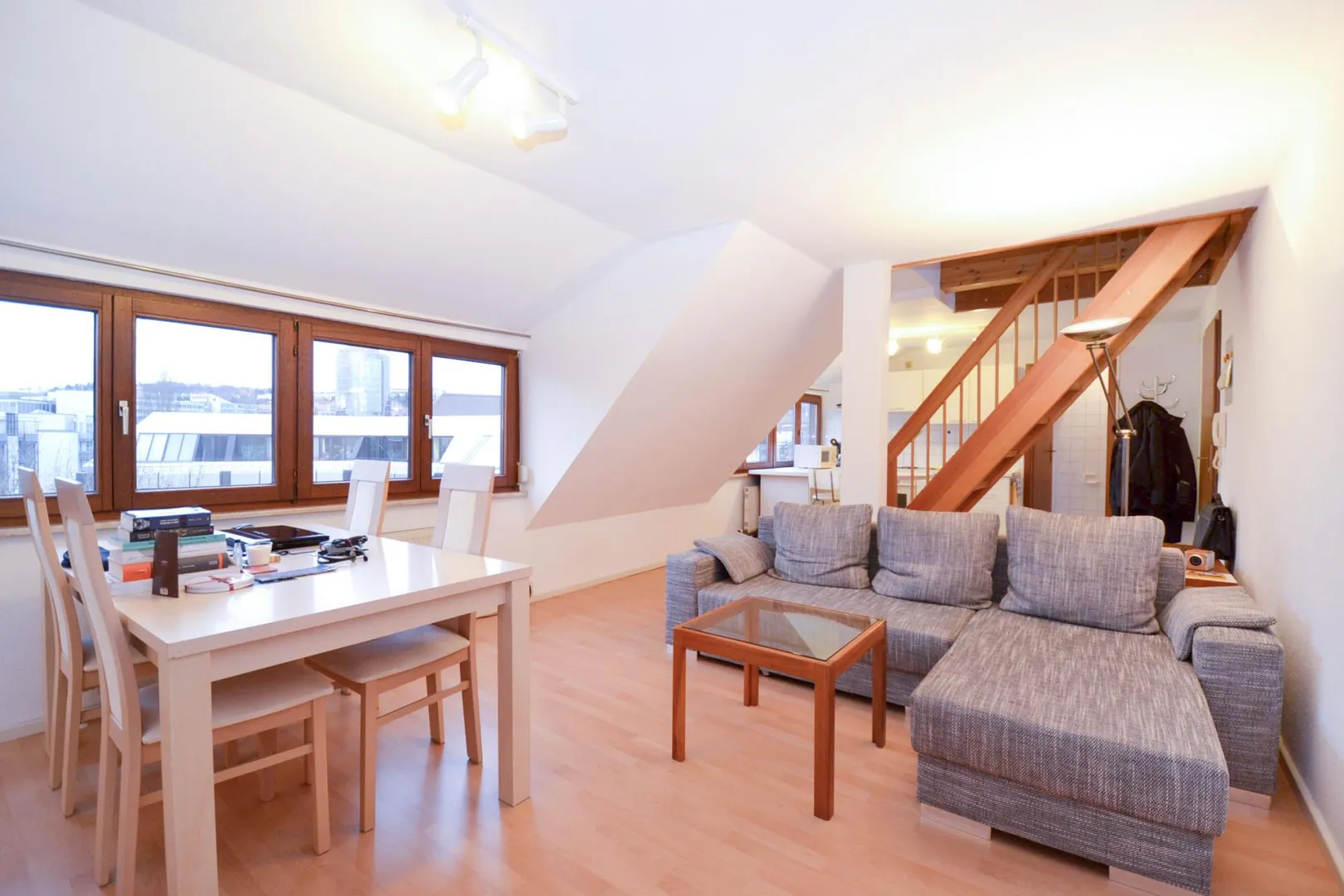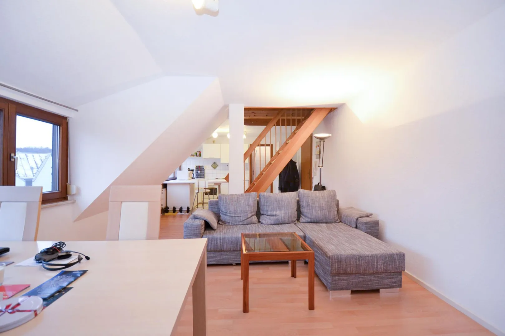 Diese offen gestaltete 2-"Zimmer"-Dachgeschoss-Wohnung ohne Balkon für eine Single-Dame befindet sich im 4. Obergeschoss.