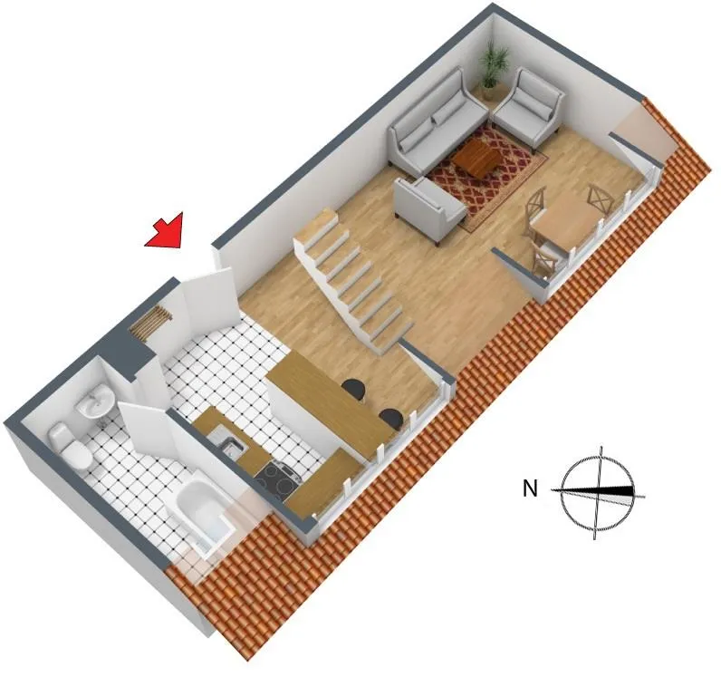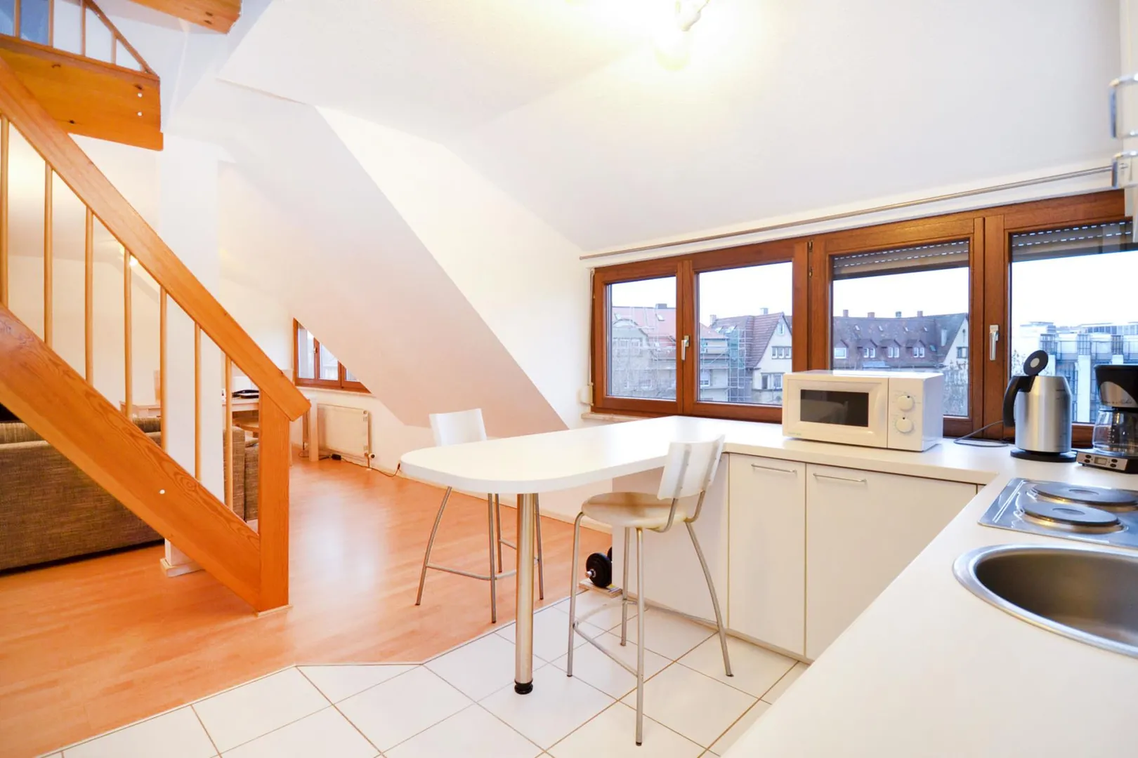 Im offenen Wohnbereich sowie im offenen Schlafbereich (Dach-Studio) sind Laminatböden verlegt. Der offene Küchen- sowie der offene Flurbereich sind mit weißem Fliesenboden ausgestattet.
