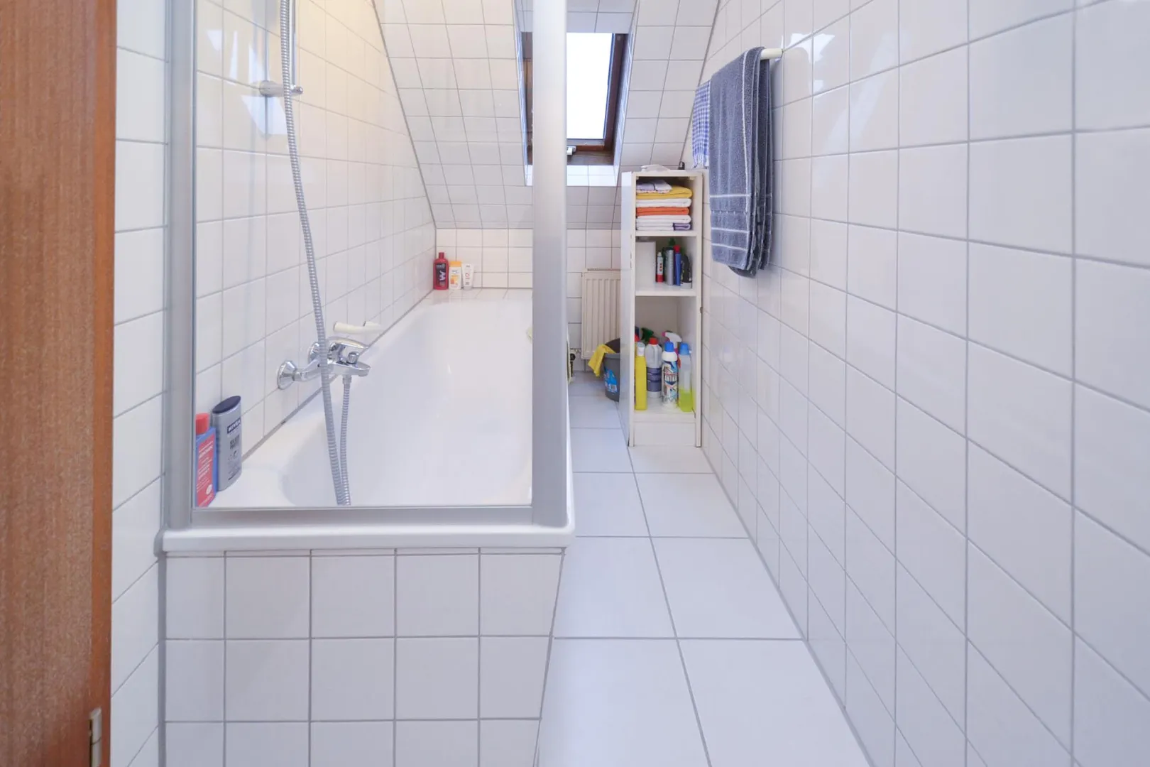 Das raumhoch geflieste Badezimmer ist ausgestattet mit einem Fliesenboden, einer Badewanne, einem WC sowie einem Spiegelschrank.