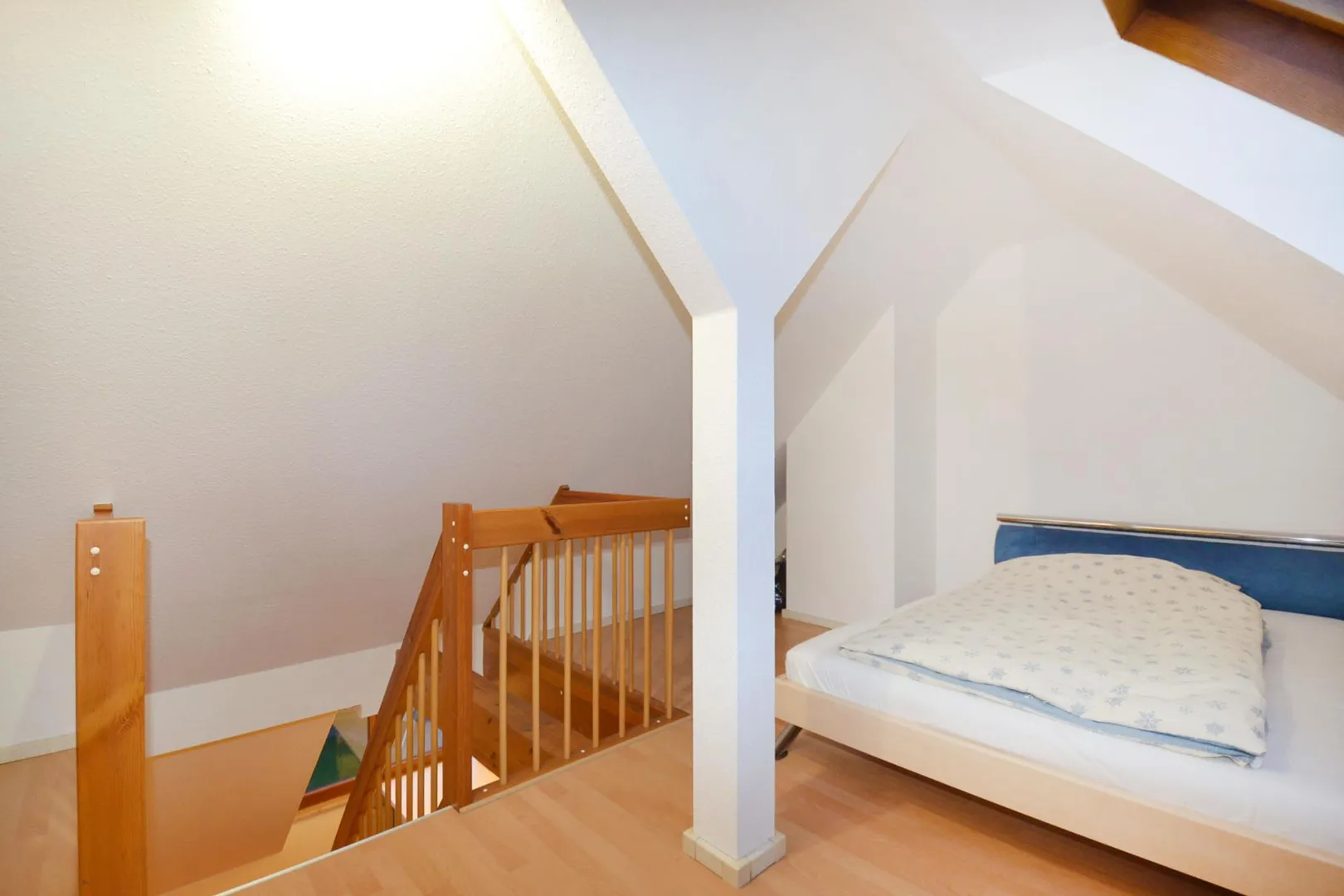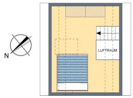 Das Dach-Studio (Schlafbereich) ist über eine Treppe vom Wohnbereich begehbar. Im Schlafzimmer ist bereits ein kompakter Kleiderschrank vorhanden.