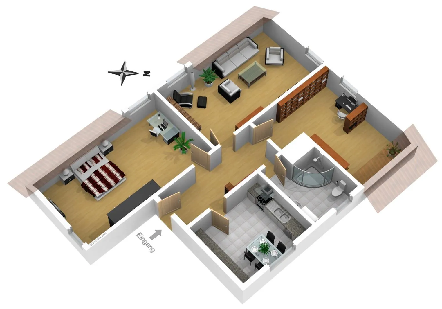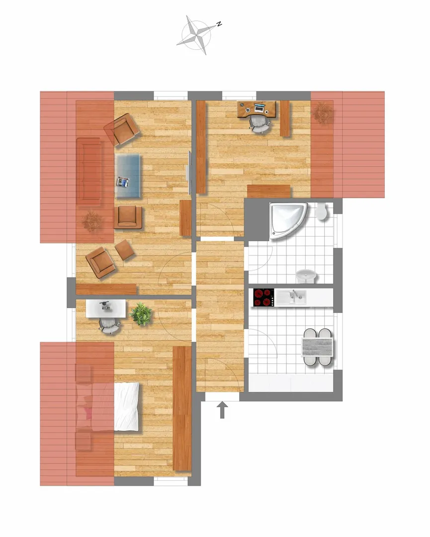 Das Wohnzimmer ist nach Süden und Westen ausgerichtet, das Schlafzimmer ist nach Süden und Osten ausgerichtet und das Arbeits-/Ankleidezimmer ist nach Westen ausgerichtet.