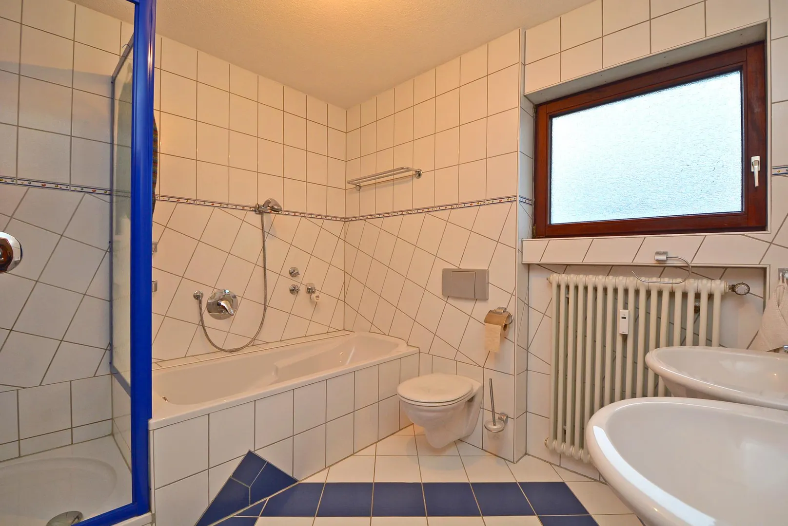 Das raumhoch geflieste Tageslicht-Badezimmer ist ausgestattet mit einer Wanne, einer Dusche, einem Doppelwaschbecken sowie einem WC.