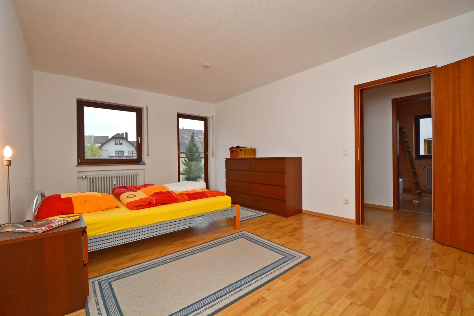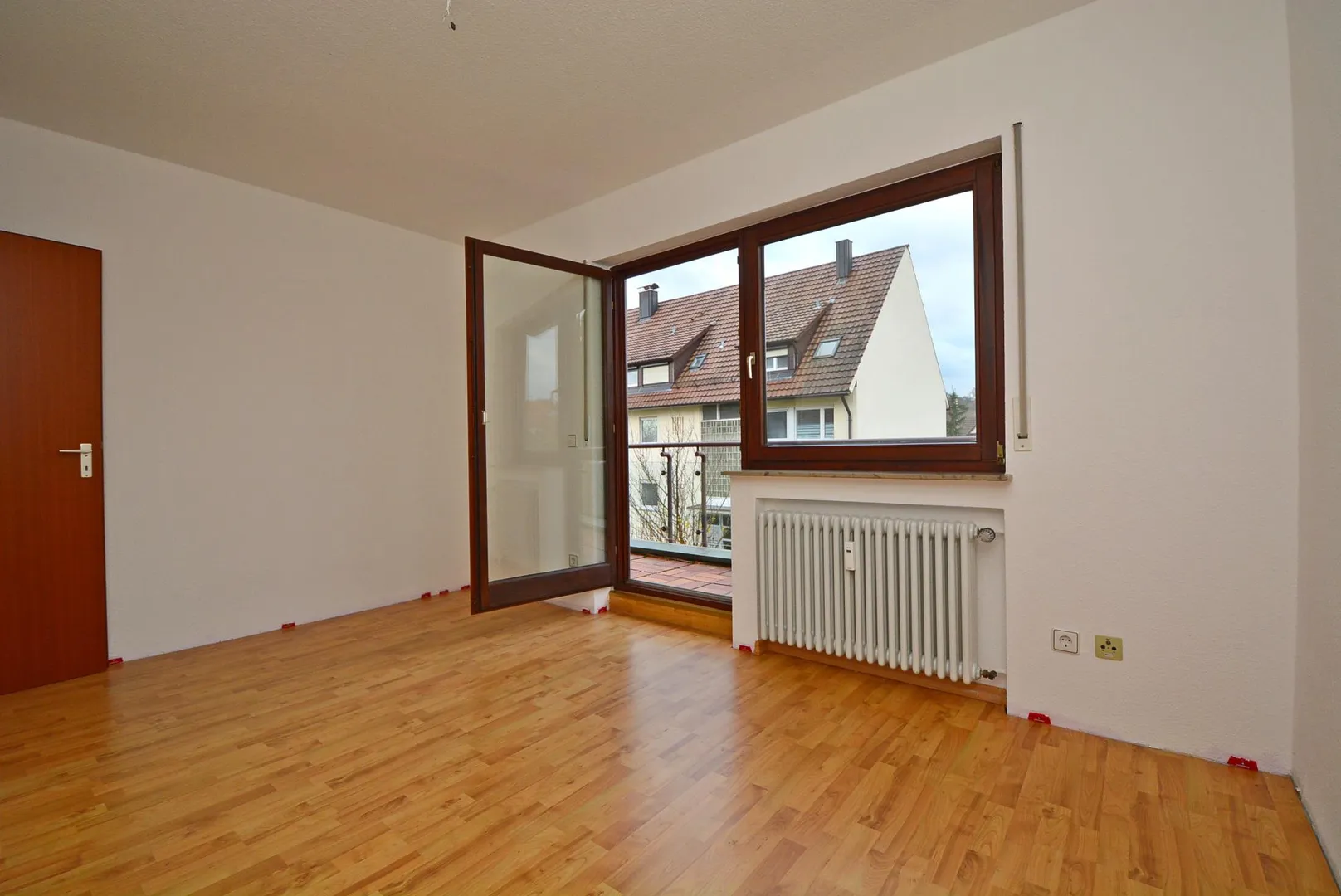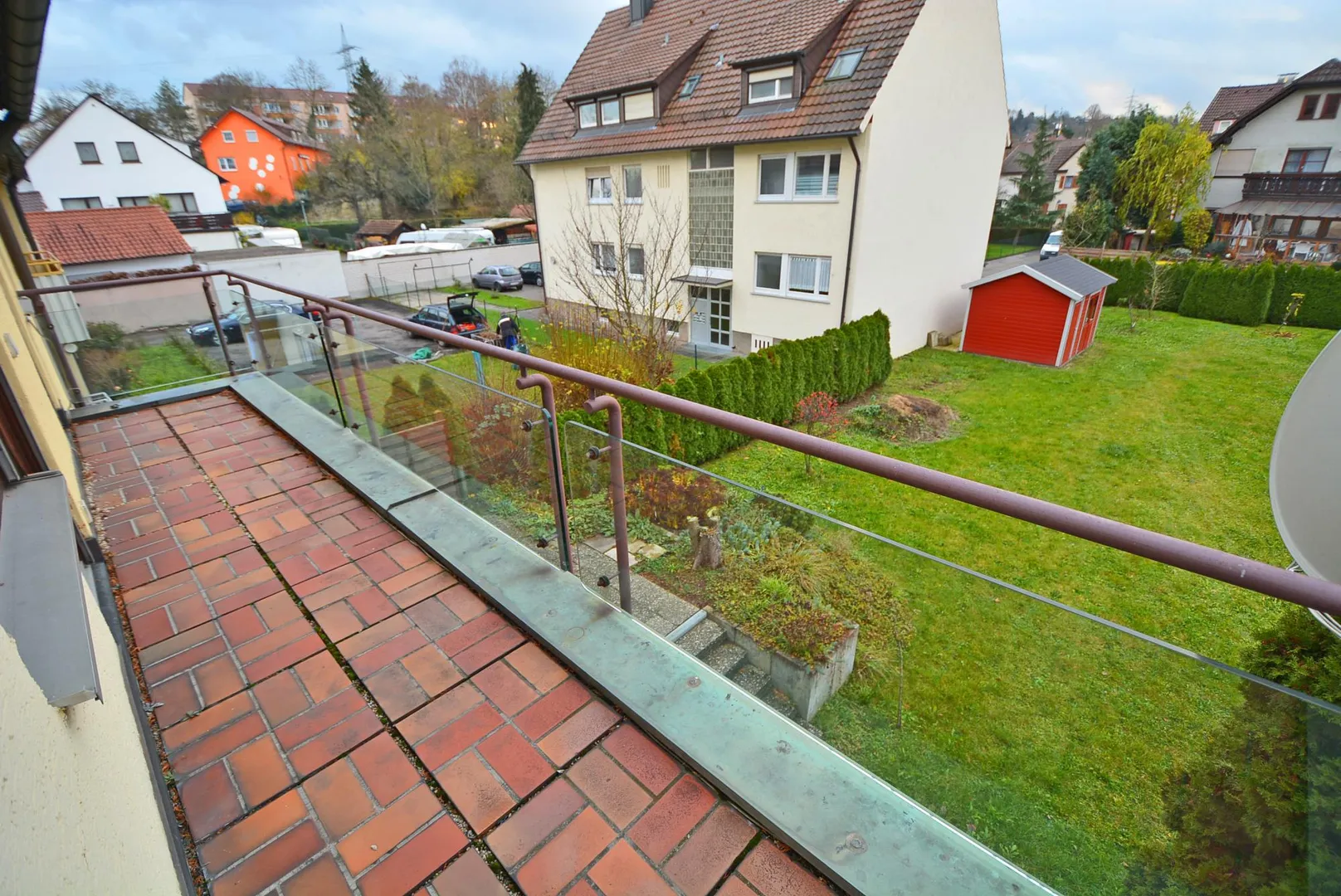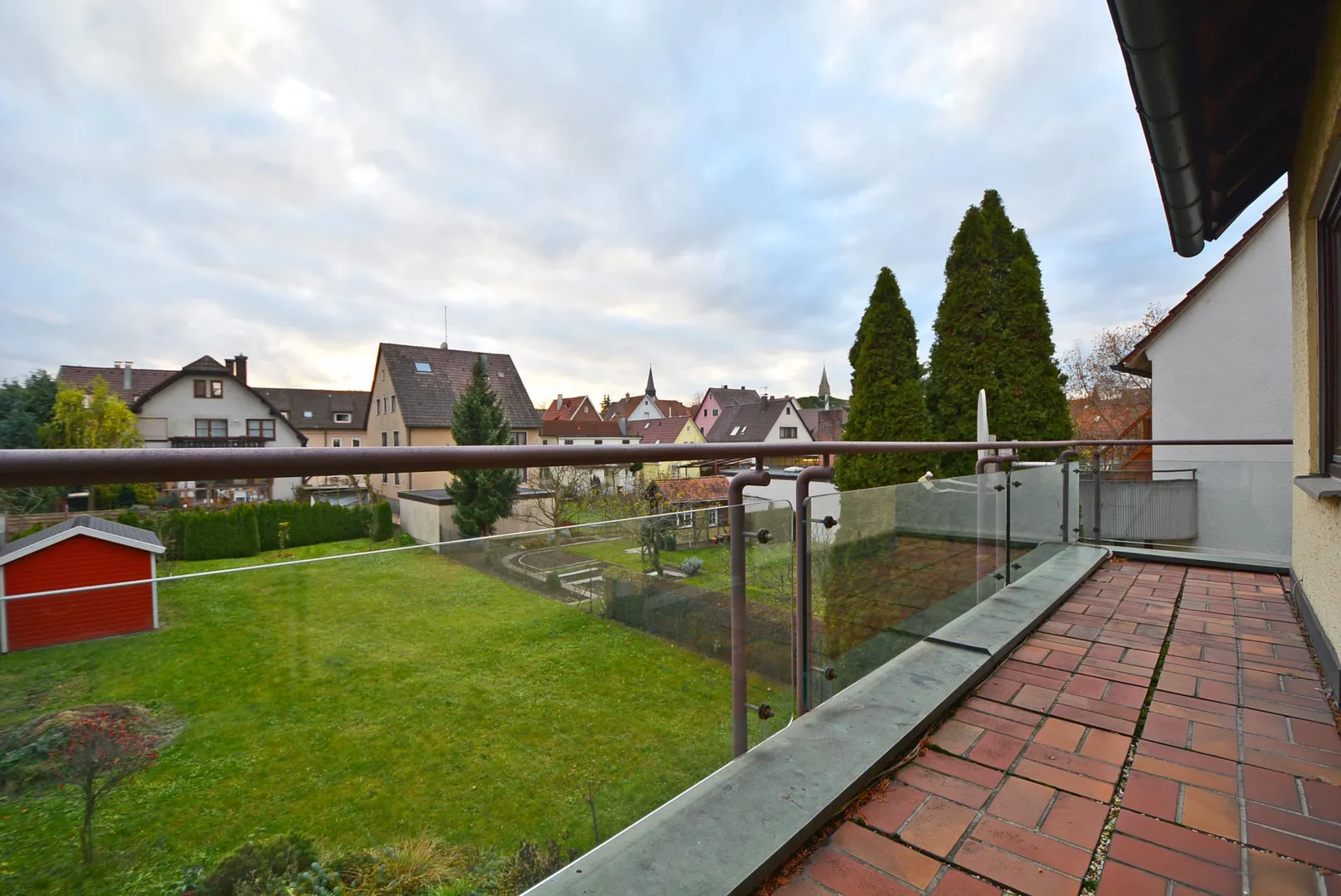 Der ca. 11 m² große Süd-Balkon mit Blick in den Garten ist vom Schlafzimmer und von einem Kinderzimmer begehbar.