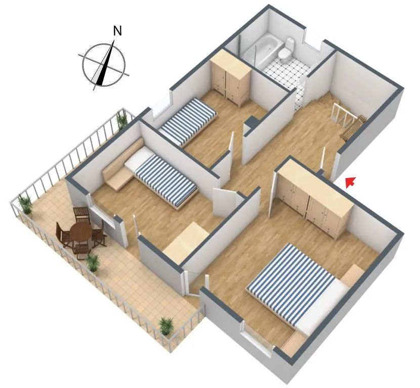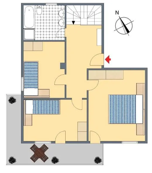 Auf der oberen Ebene befinden sich ein großer Flur, ein Schlafzimmer, zwei Kinderzimmer sowie ein Badezimmer.
