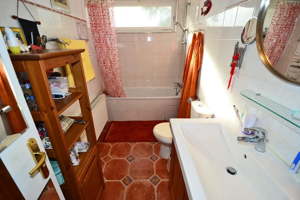 Das halbhoch geflieste Tageslicht-Bad ist ausgestattet mit einer Badewanne und einem WC.