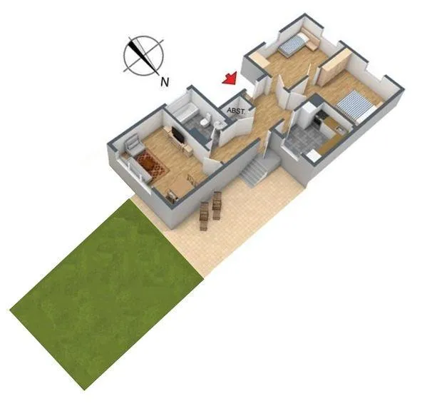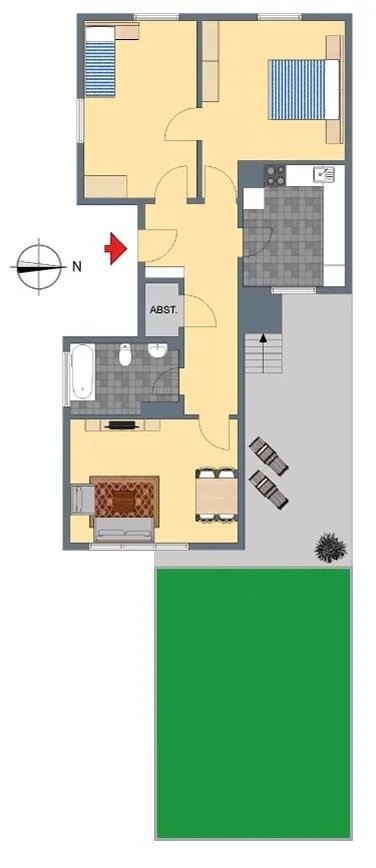 Der Grundriss der Wohnung ist gut. Alle Räume sind vom Flur aus begehbar. Das Badezimmer verfügt über ein Fenster. Die Terrasse und der Garten sind über den Flur erreichbar. In der Wohnung befindet sich ein Abstellraum.