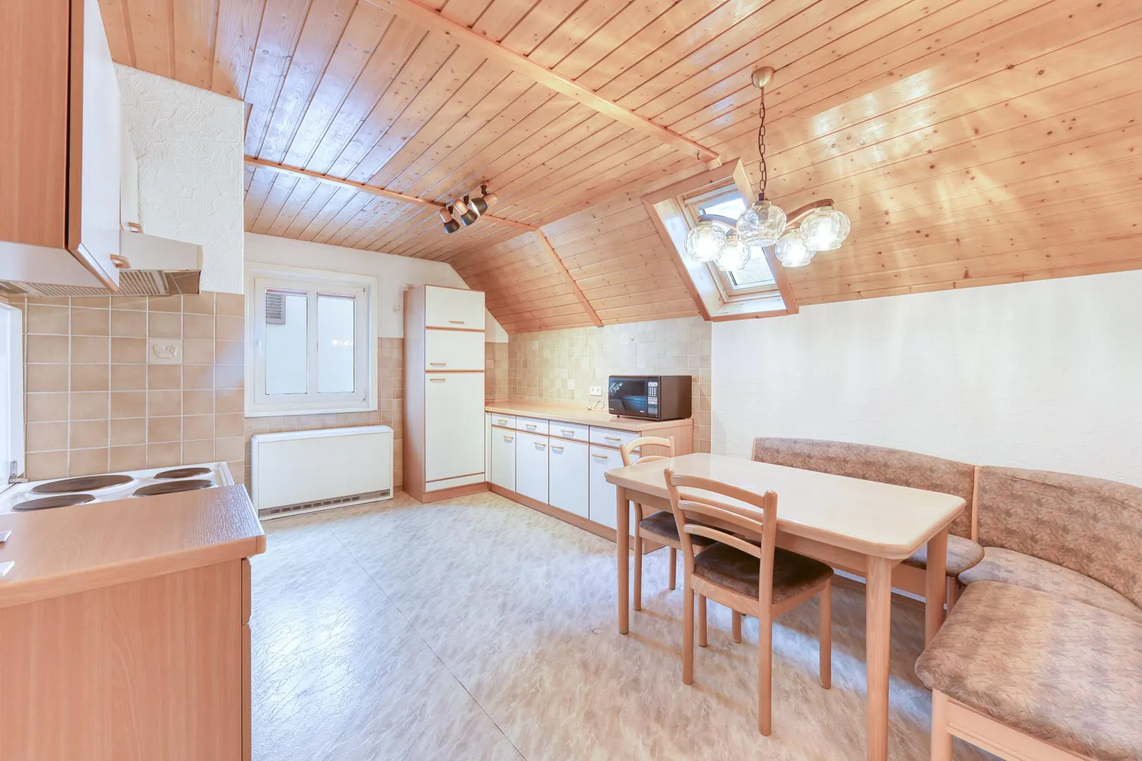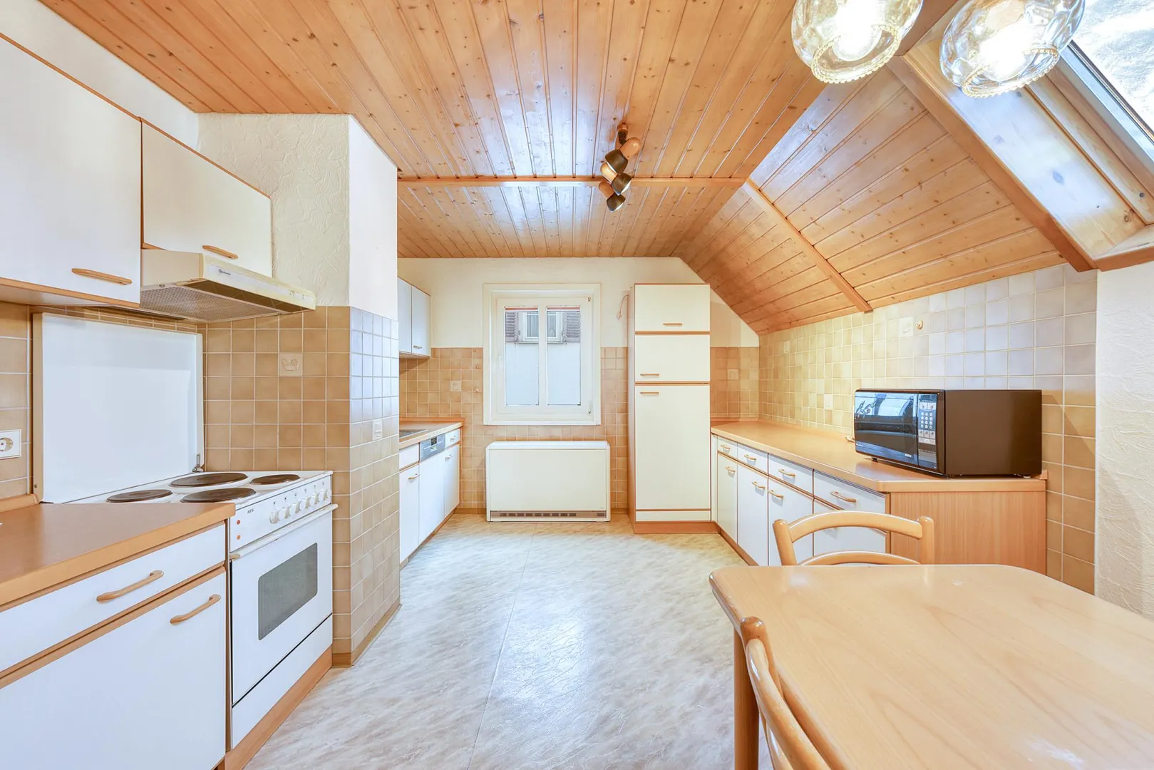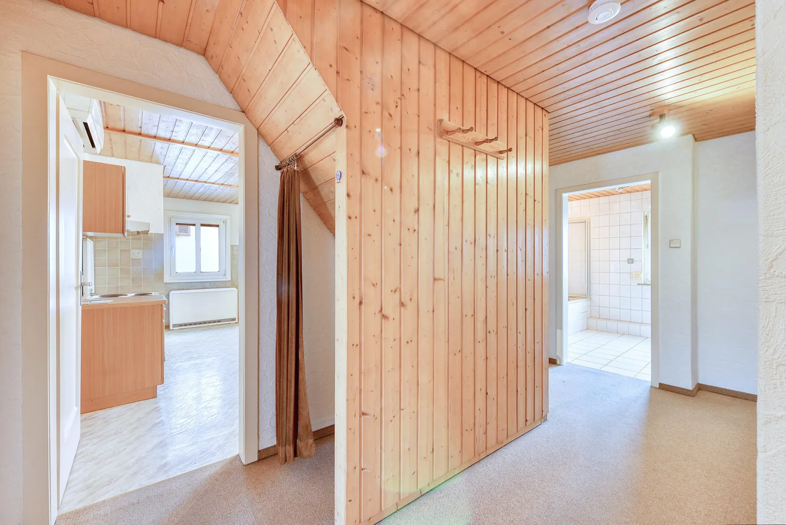 Im Dachgeschoss 1 befinden sich der Eingang, zwei Zimmer, die Wohn-Küche, das Badezimmer, ein separates WC sowie der Aufgang zum Dachzimmer.
