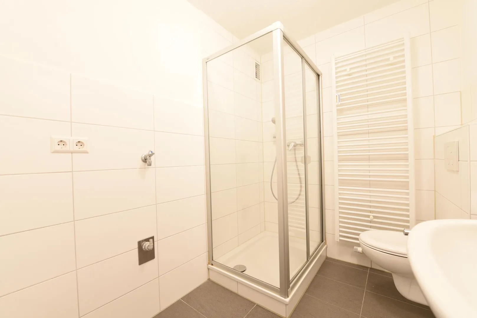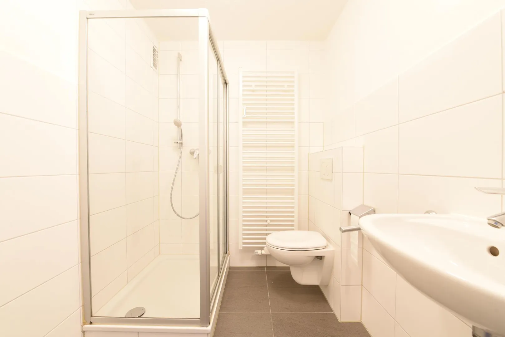 Das teilweise halbhoch und teilweise raumhoch geflieste Badezimmer ist ausgestattet mit einer Dusche, einem WC, einem Handtuch-Heizkörper und einem Waschmaschinenanschluss.