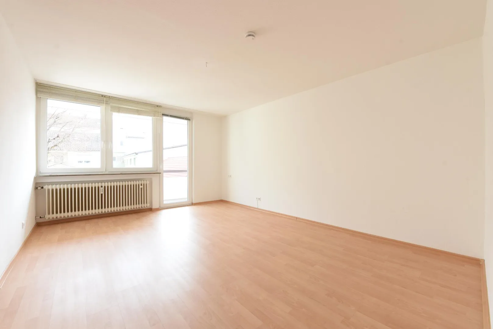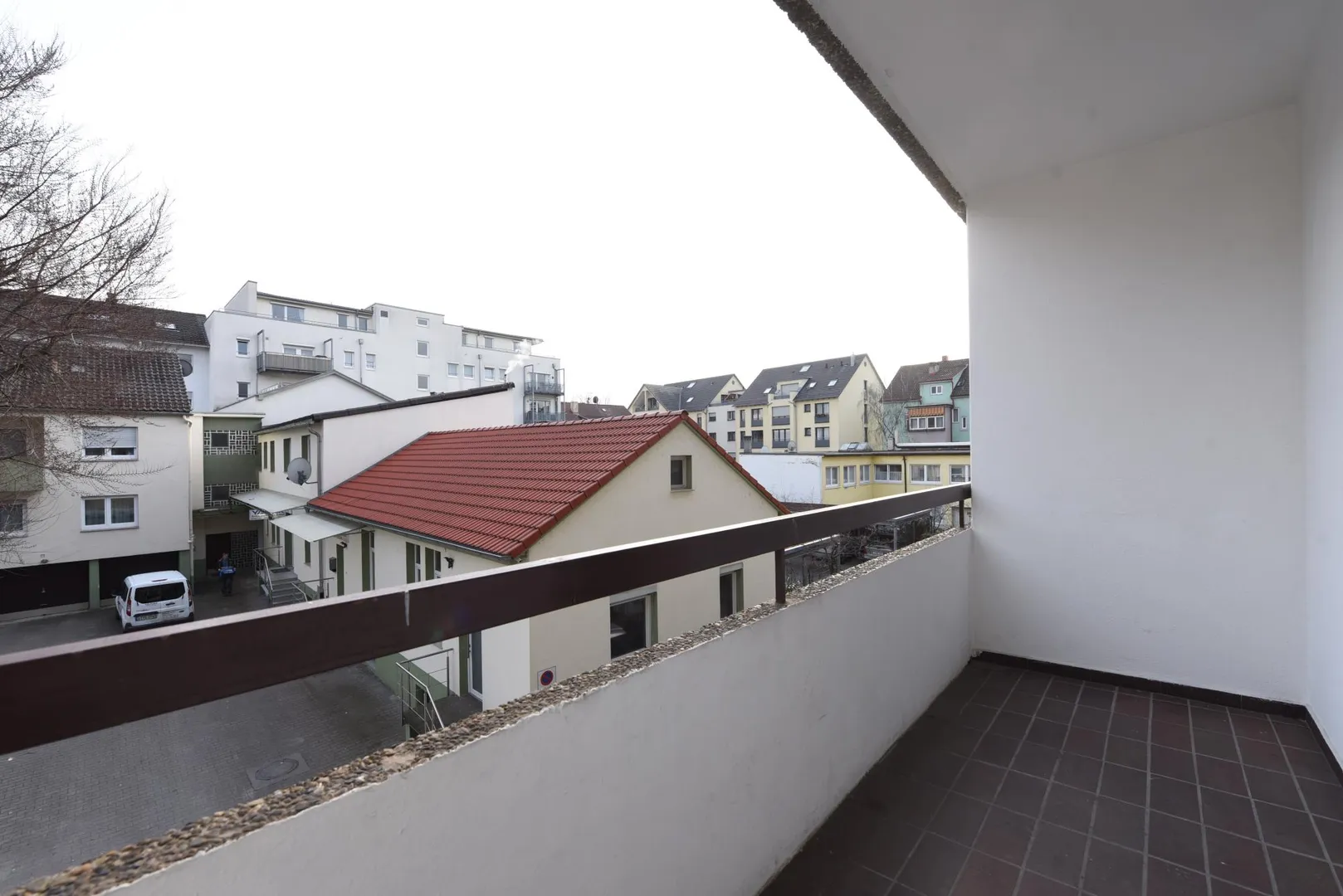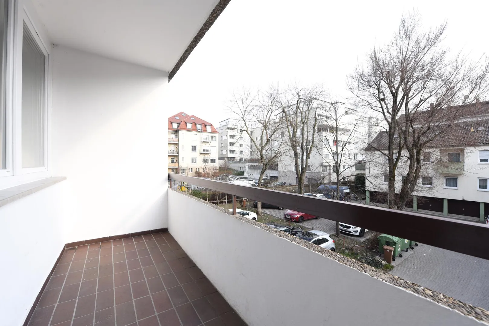 Der ca. 4,5 m² große und überdachte Balkon ist über das Wohnzimmer begehbar.